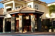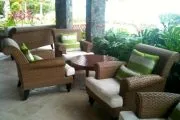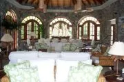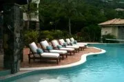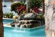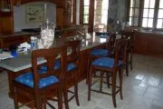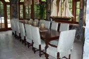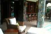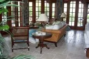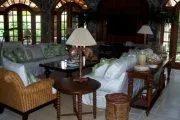 Outside the main villa is the covered poolside terrace, it is well appointed with posh upholstered chairs and a round table for those special meals. The kitchen has an attached counter with bar stools. This huge outdoor living area has two gas grills; one is actually located in a lovely garden.