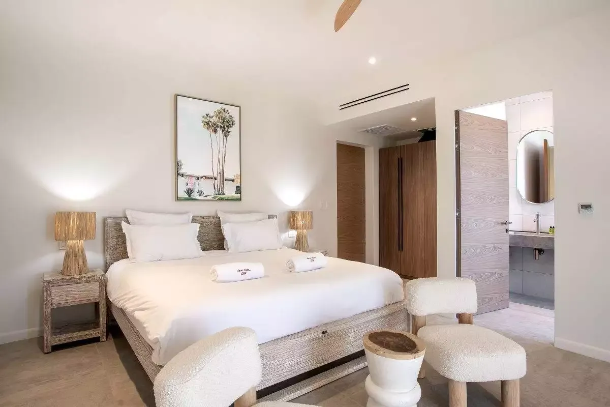 Walking through the entrance, guests will find themselves welcomed by a sense of openness and splendor. Villa Aqua Vista’s open-concept design offers guests panoramic 270° views of the expansive indigo Caribbean waters through large windows. Vogue yet refined interior decor, featuring neutral tones and top-of-the-line furnishings, complement Villa Aqua Vista’s modern aesthetic.