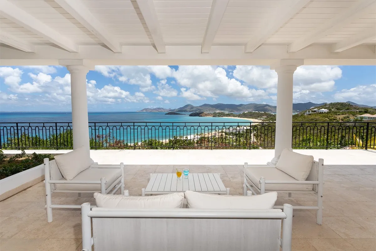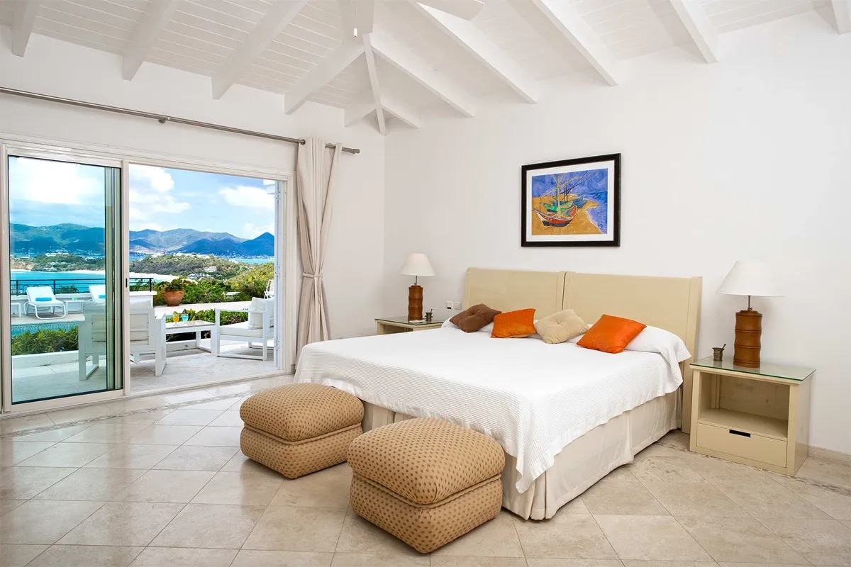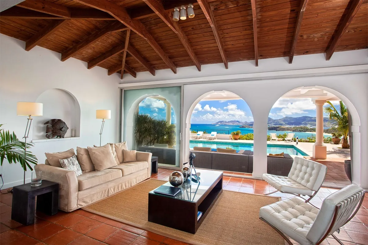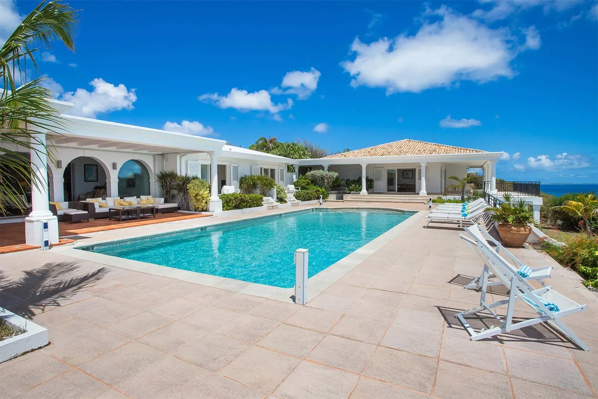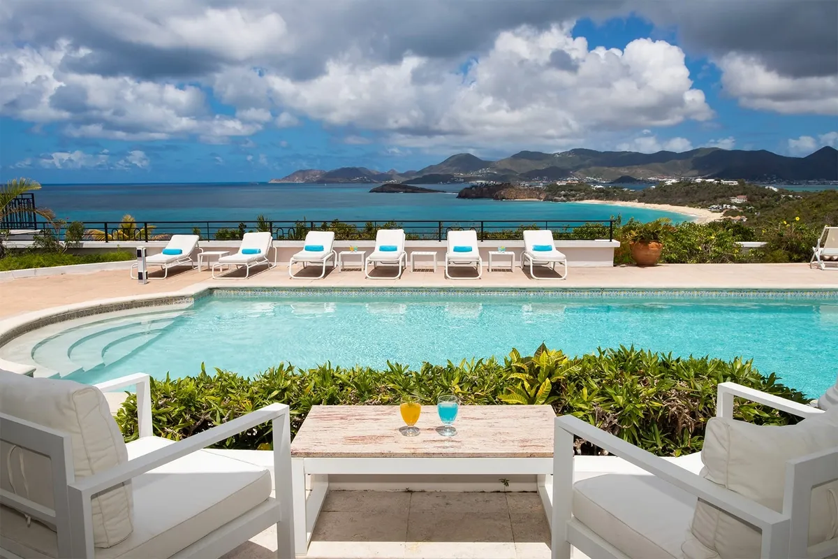 This luxurious villa on a hill overlooking Baie Rouge is facing the Caribbean Sea, the far distant St Martin’s mountains, and the island of Anguilla.