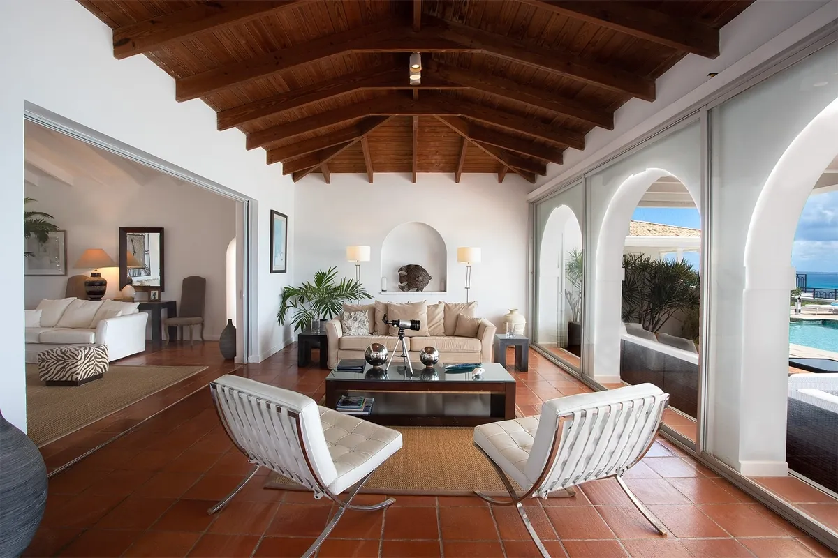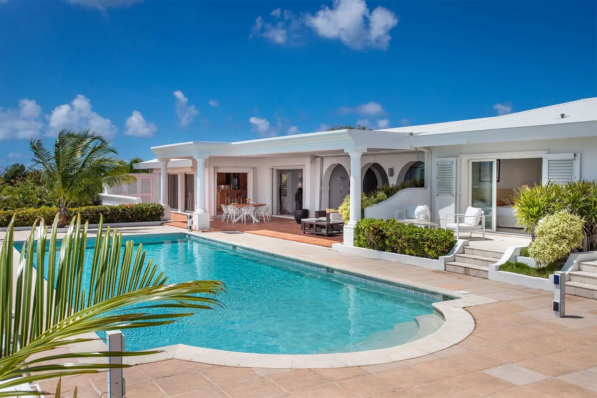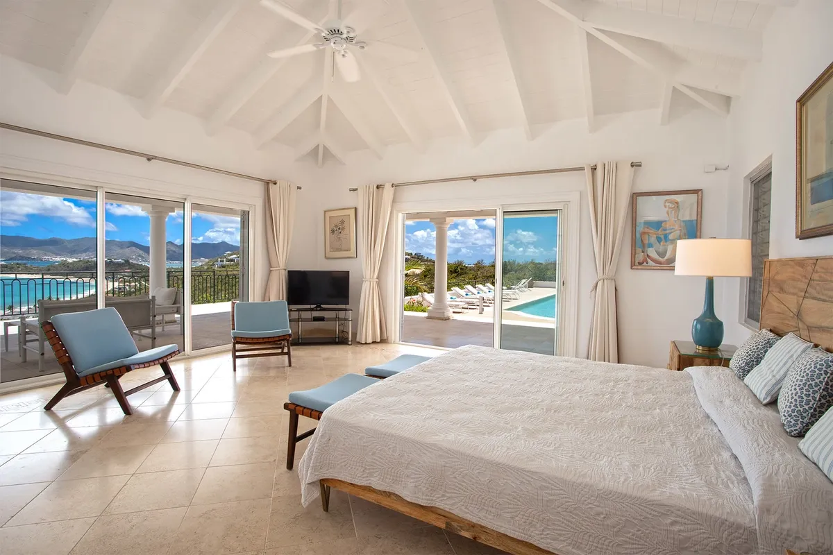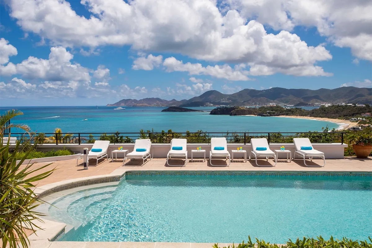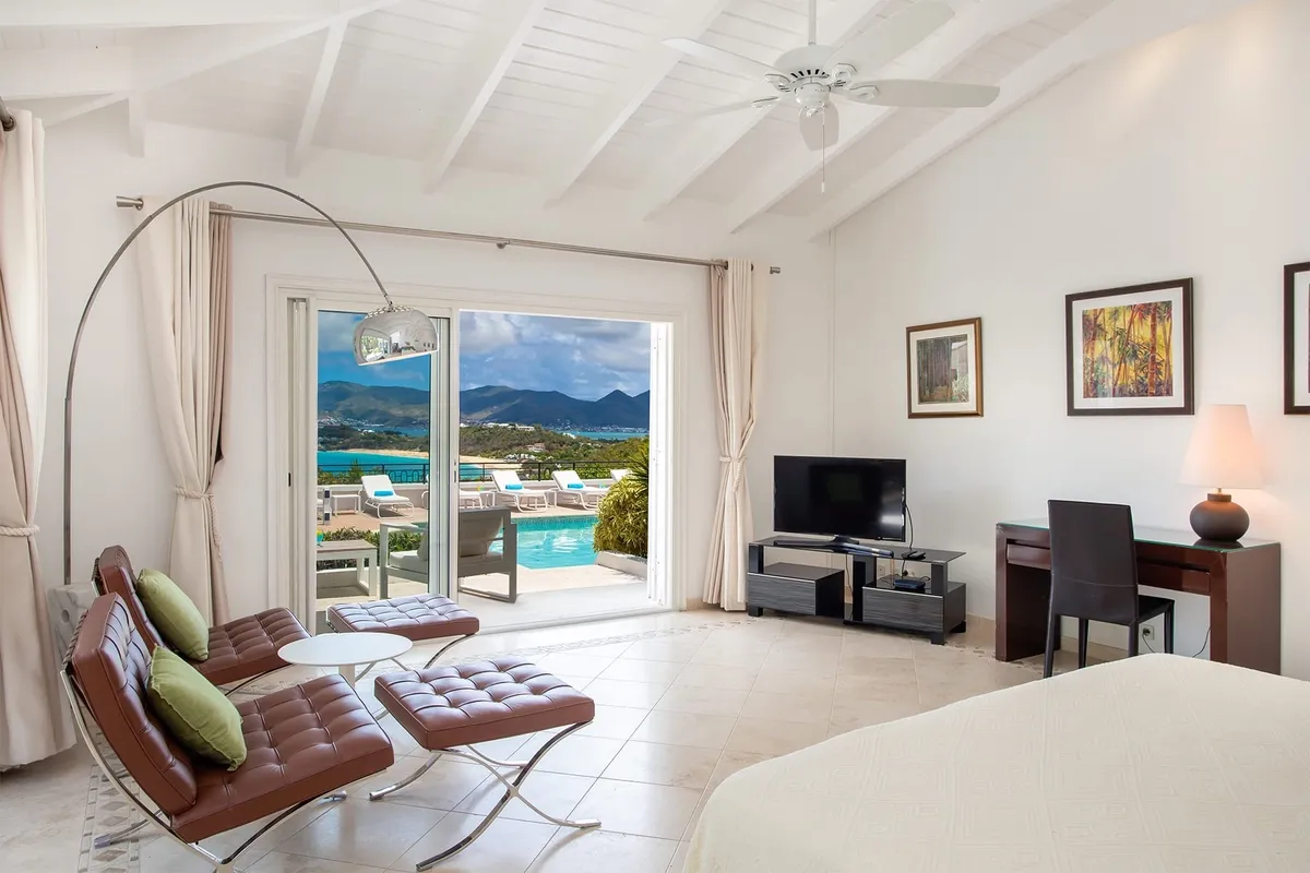 This luxurious villa on a hill overlooking Baie Rouge is facing the Caribbean Sea, the far distant St Martin’s mountains, and the island of Anguilla.