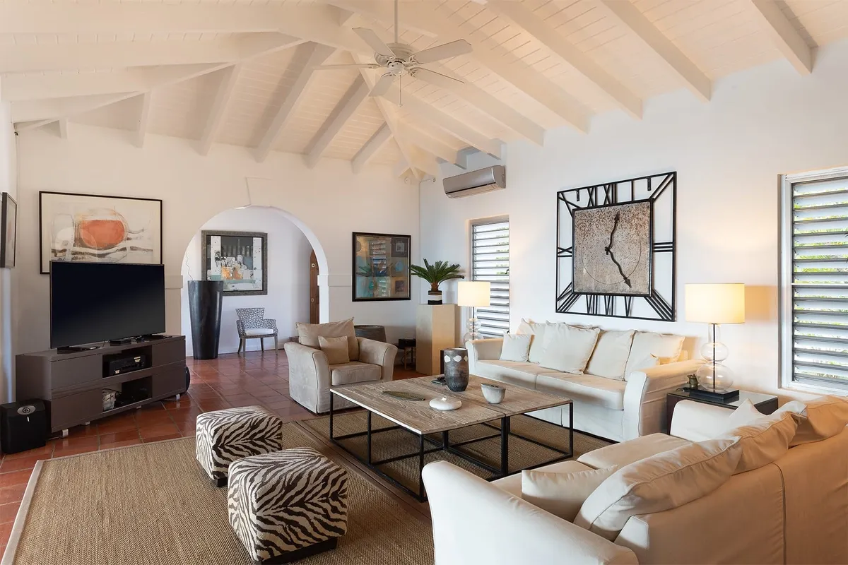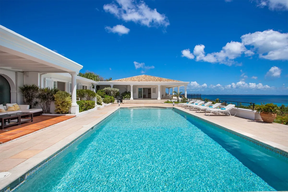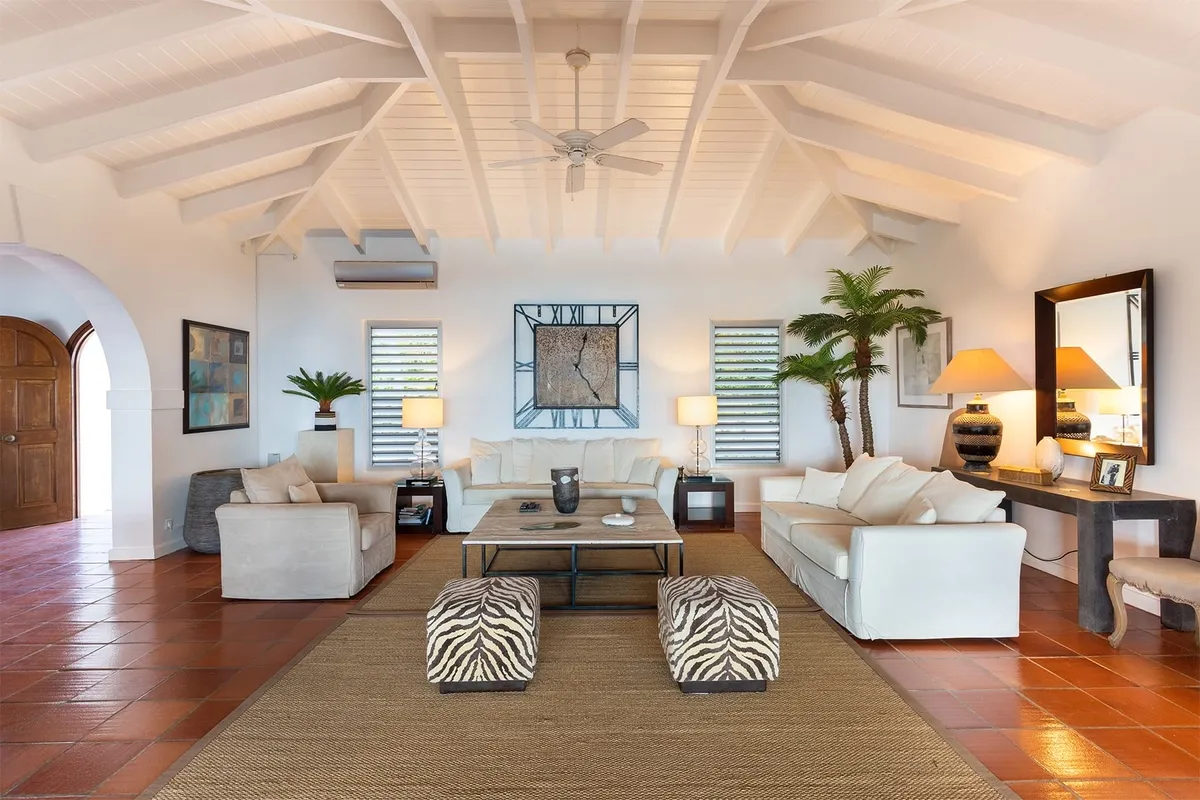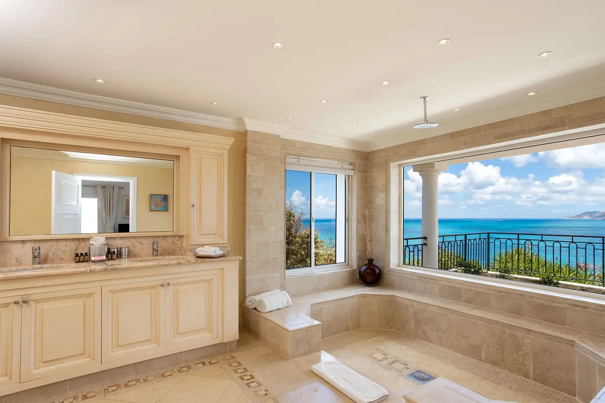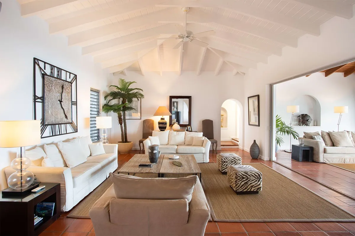 This luxurious villa on a hill overlooking Baie Rouge is facing the Caribbean Sea, the far distant St Martin’s mountains, and the island of Anguilla.