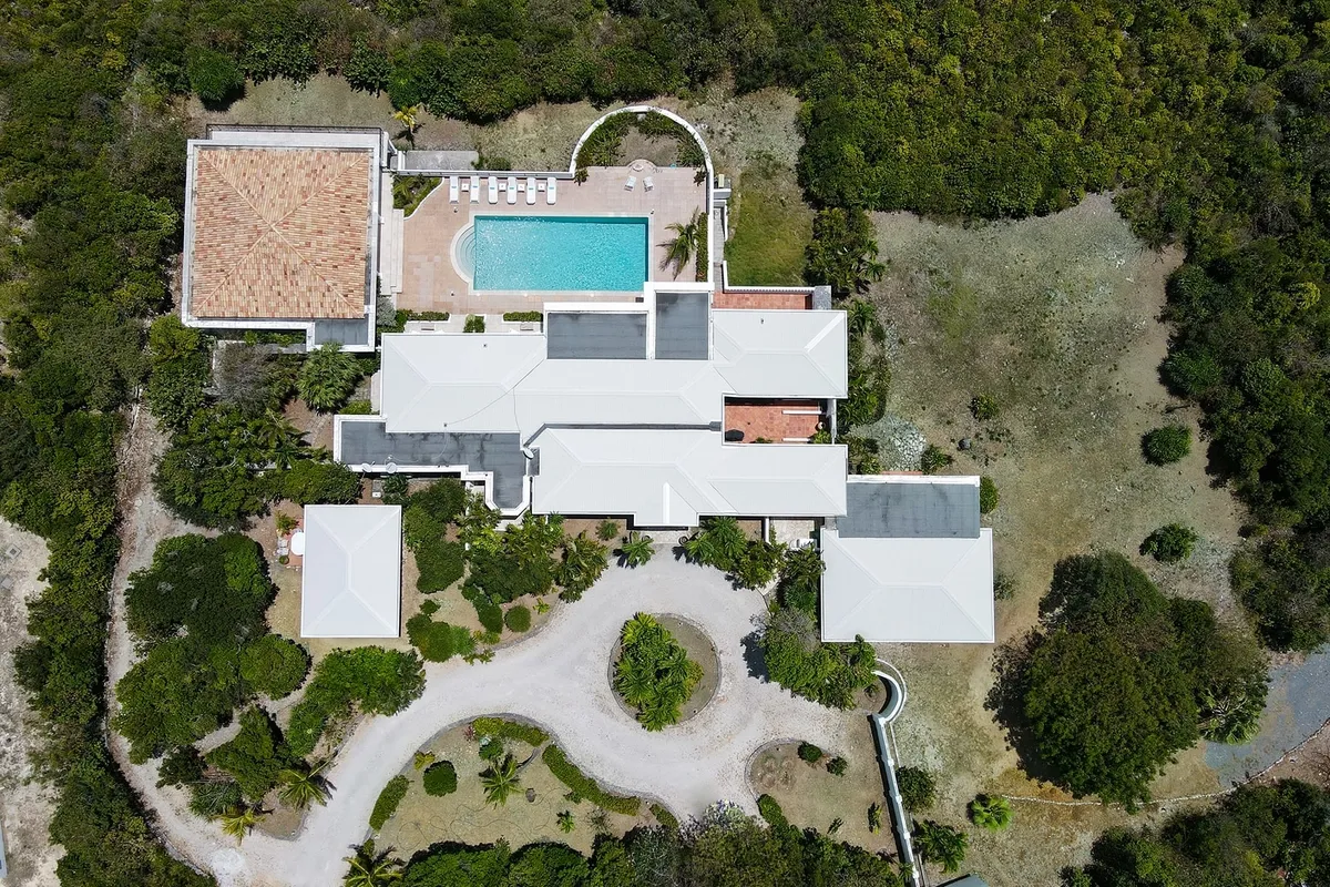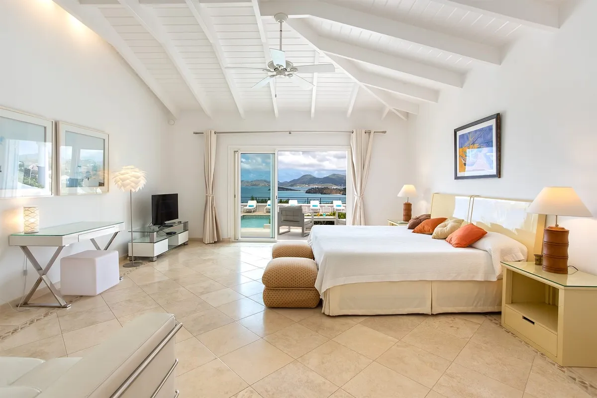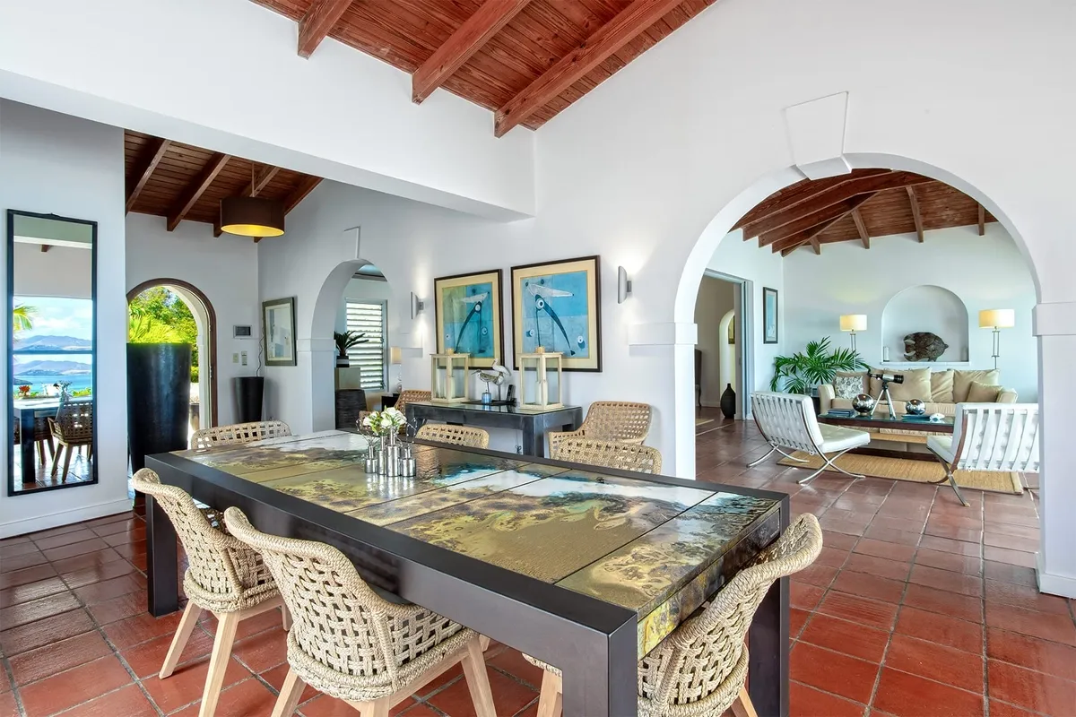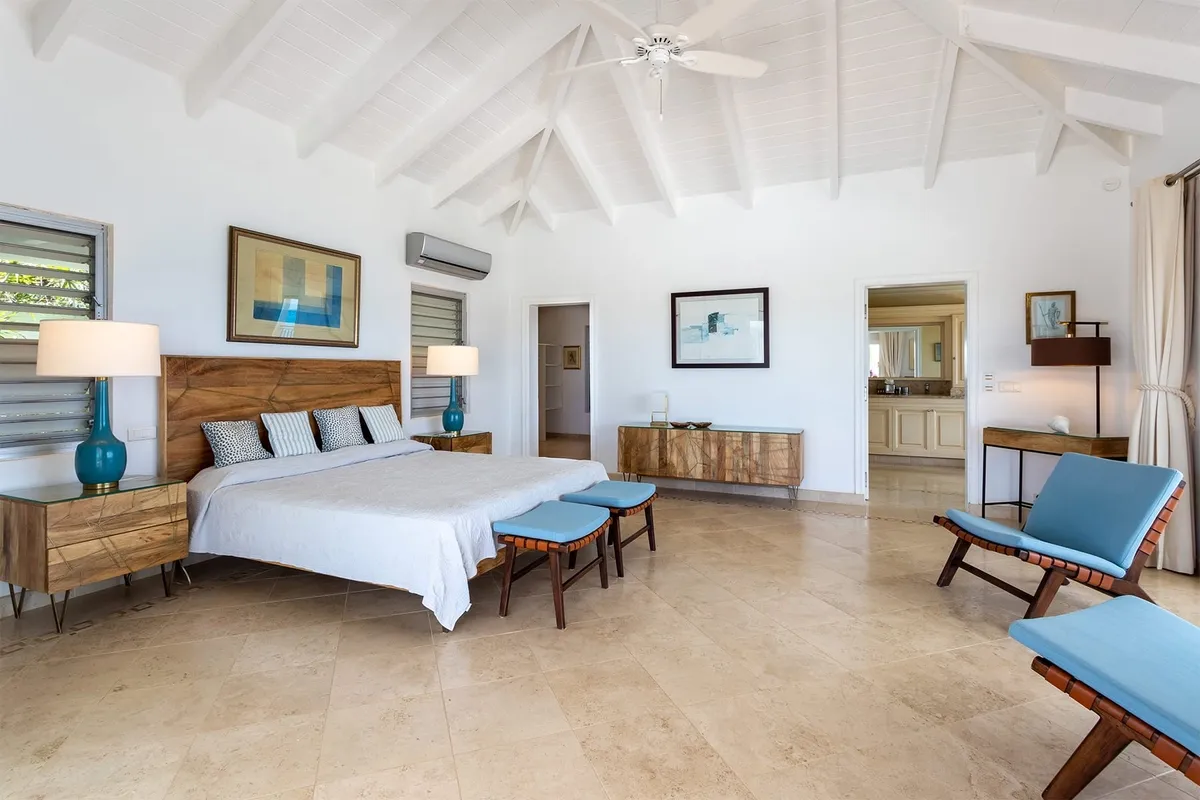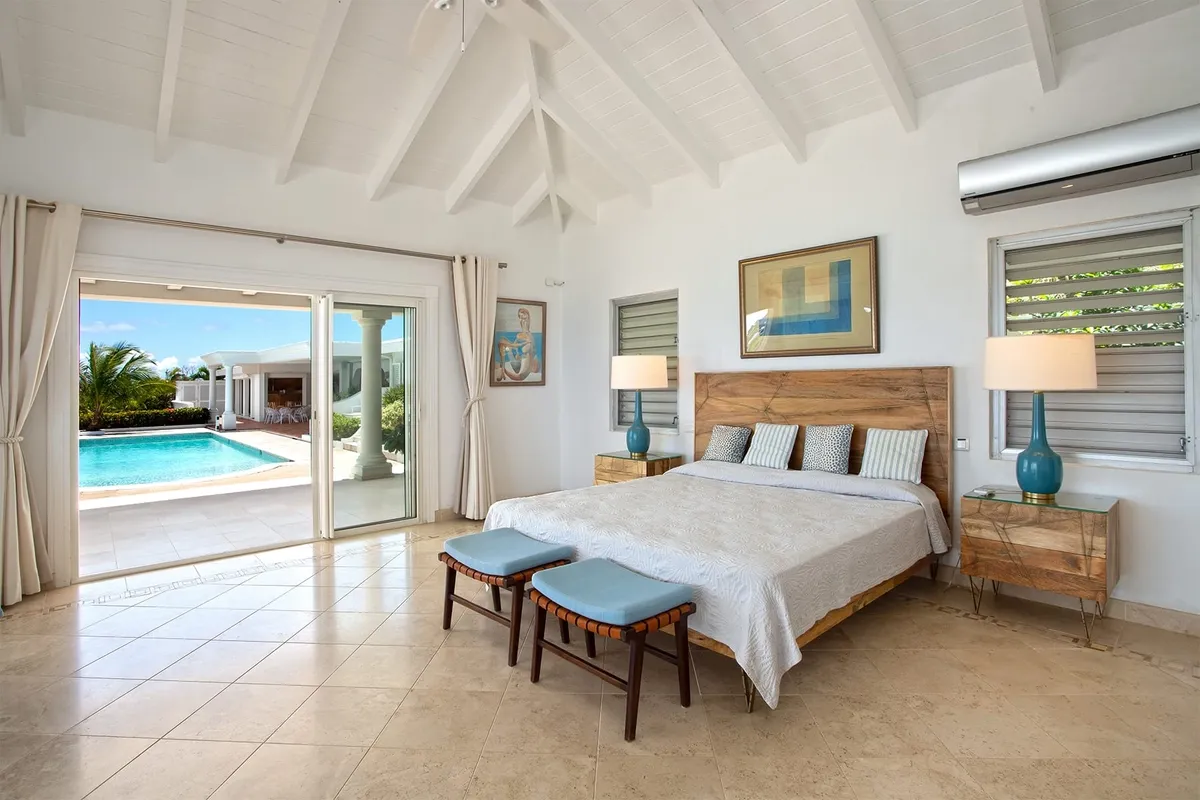 This luxurious villa on a hill overlooking Baie Rouge is facing the Caribbean Sea, the far distant St Martin’s mountains, and the island of Anguilla.