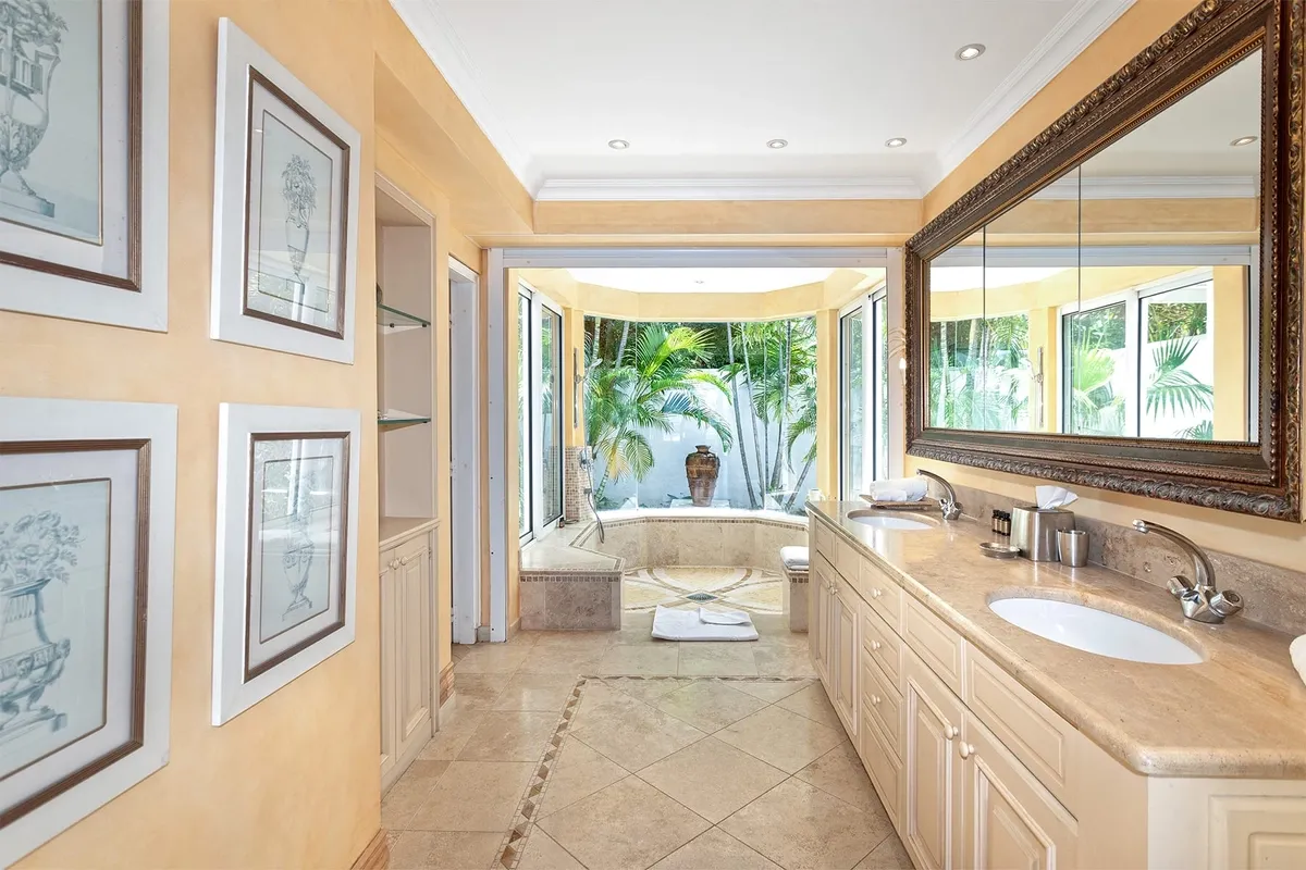 You enter a double living-room connected with a 2-arches dining-room, outside dining, and living-room near a large 50’x20′ heated swimming pool.