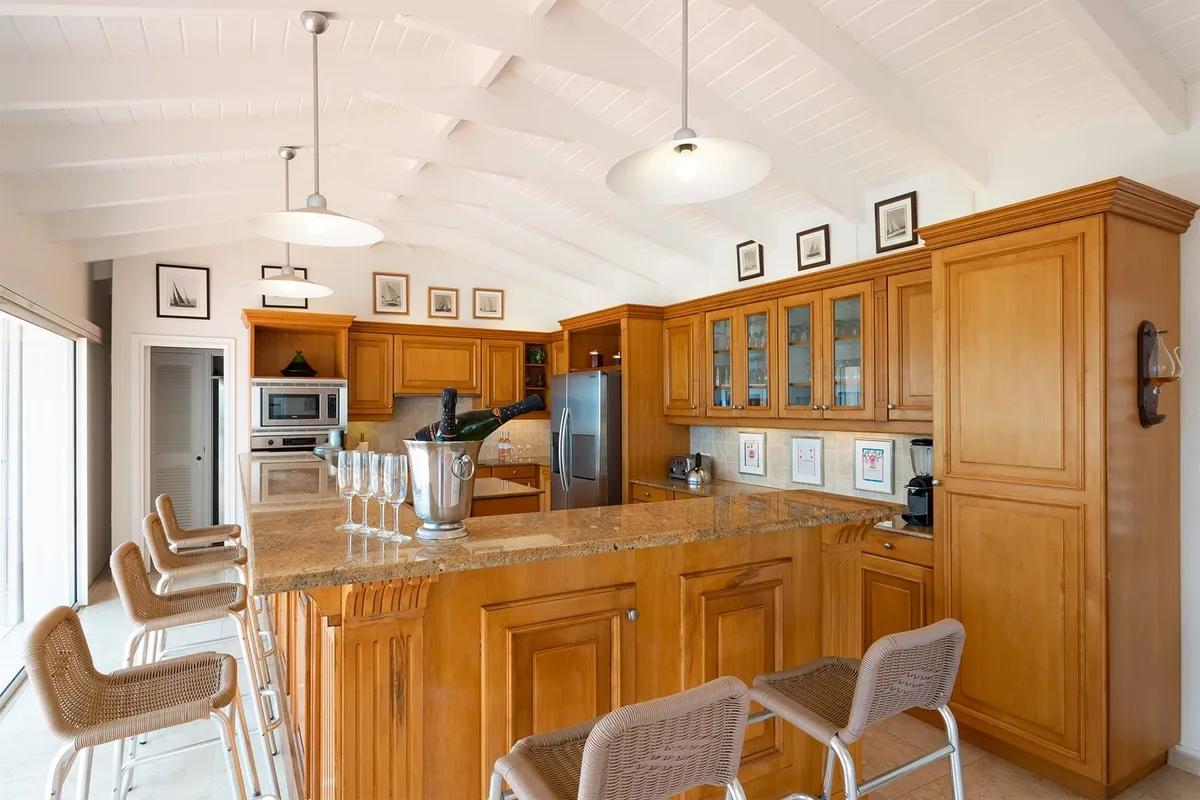 A very large Kitchen-Bar facing Baie Rouge with a double sliding window and granite countertops makes the cooking a pleasure.
