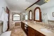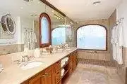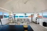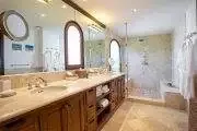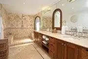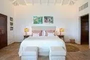 Four of the five bedrooms face the ocean. Each is a large, airy suite with interior private seating. The large spa style bathrooms’ feature tumble marble tiles with mosaic trim, walk in showers and high end touches. One bedroom is set in a private cottage.