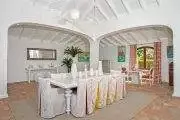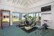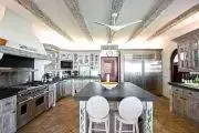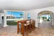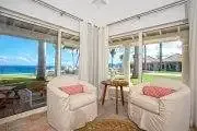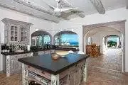 The interiors are spacious and stylish. Tropical shutters in dark wood trim the doors and windows. Columns and arches define the multiple lounging and dining areas, all furnished with high end furnishings. Rattan, teak and upholstered pieces with colorful fabrics all mix beautifully. The color scheme is refined naturals accented with beautiful tropical lime, hot pink and taupe. Well curated art and accessories compliment the décor. The state of the art chef’s kitchen is tastefully appointed in bleached woods, black granite and high end appliances. The space is open to the views.