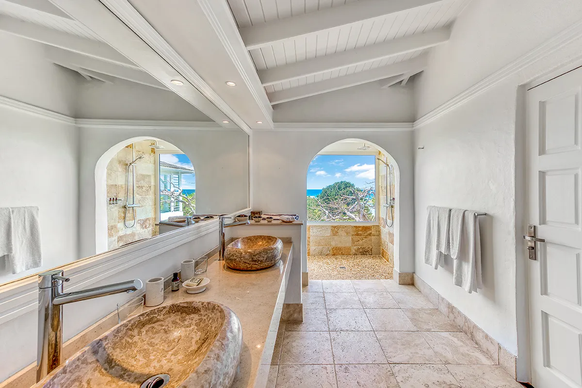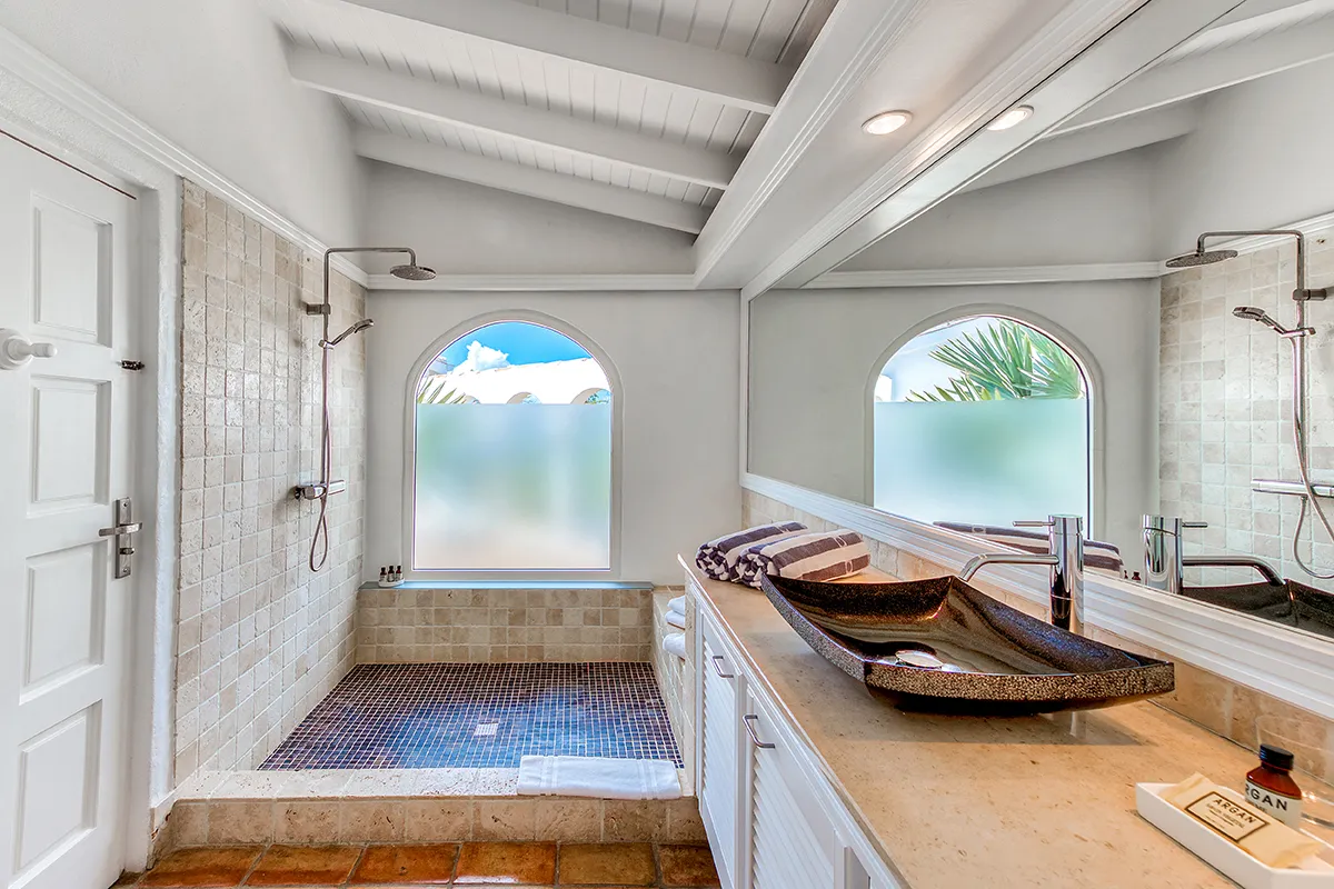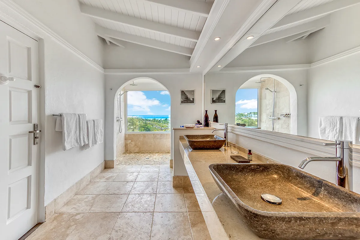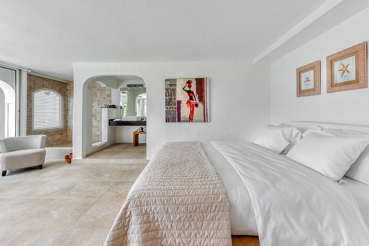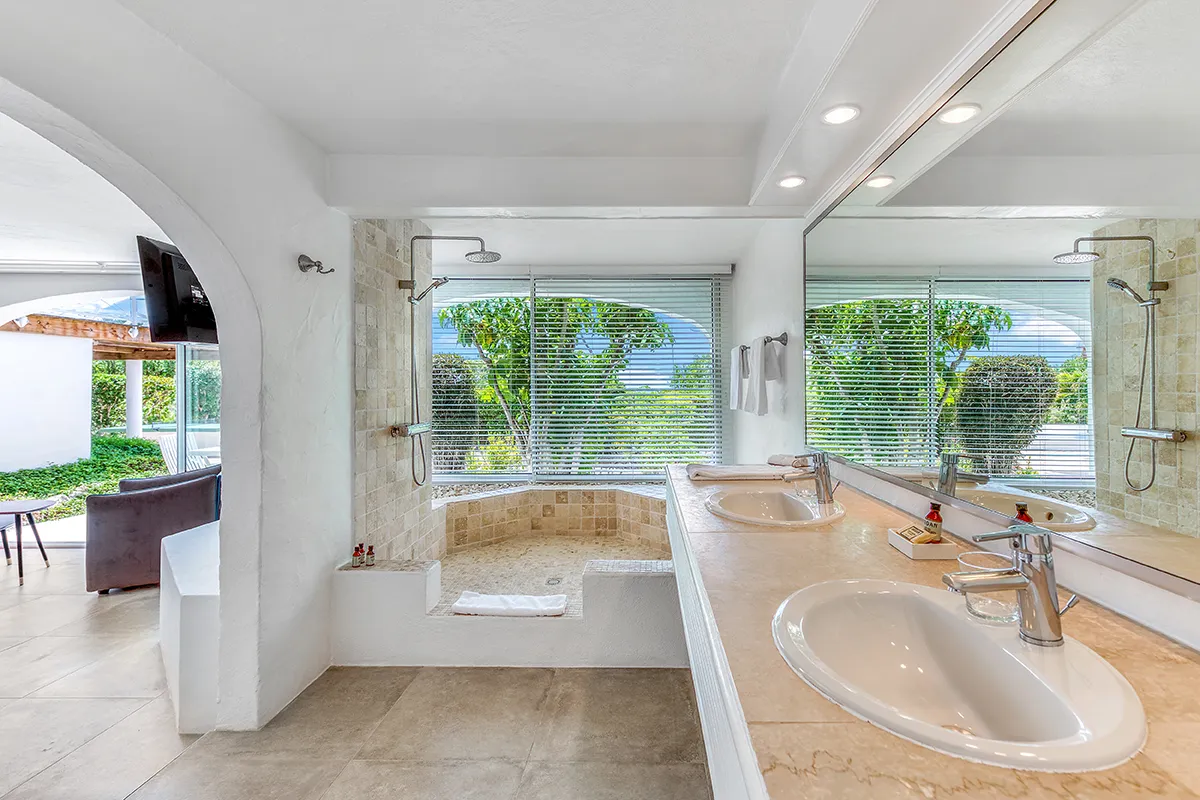 Villa Belle Fontaine boasts five spacious bedrooms, each of equal size. Three of the bedrooms offer sea views, while the other two overlook the garden. The spa-style bathrooms are beautifully designed with luxurious fixtures. You’ll find large walk-in showers that overlook either the sea or the garden, and one of the bathrooms even features a private outdoor patio.