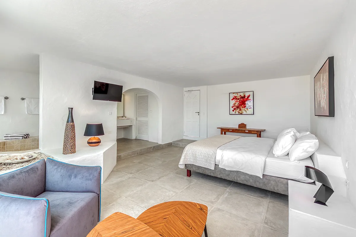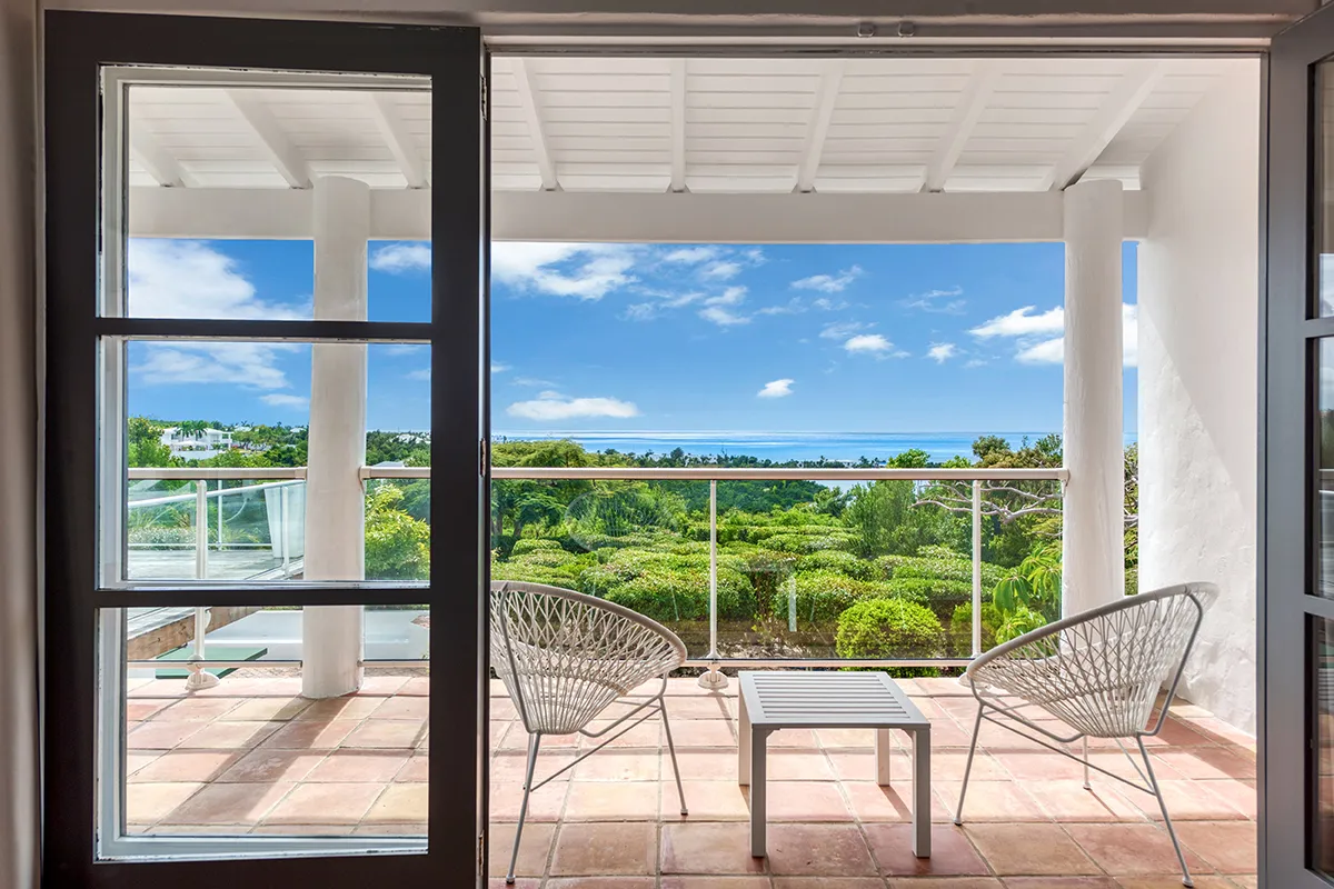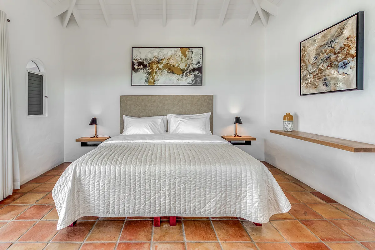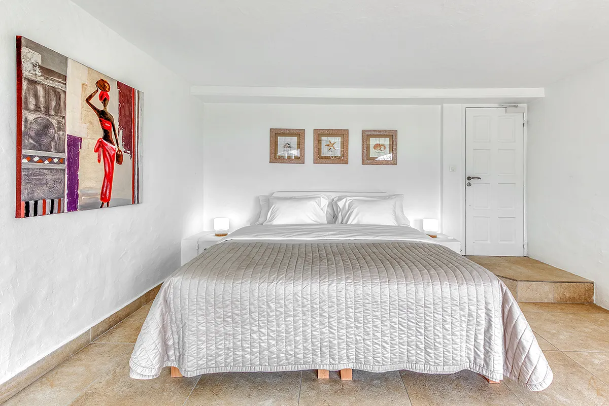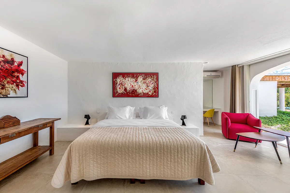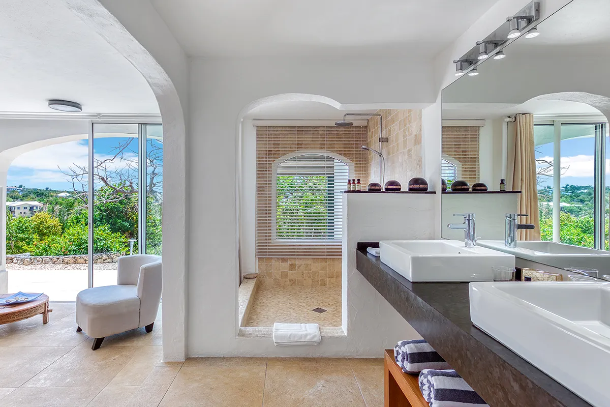 Villa Belle Fontaine boasts five spacious bedrooms, each of equal size. Three of the bedrooms offer sea views, while the other two overlook the garden. The spa-style bathrooms are beautifully designed with luxurious fixtures. You’ll find large walk-in showers that overlook either the sea or the garden, and one of the bathrooms even features a private outdoor patio.