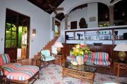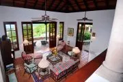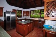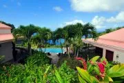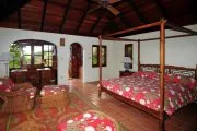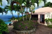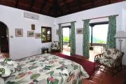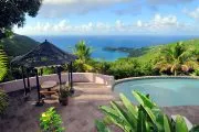 The moment you drive into the gated, magical grounds of Canefield House, you’ll be enchanted by its glorious gardens set on 10 lush acres, encompassing a very private park-like setting. This estate home was built about 17 years ago where sugar cane was once grown during plantation days. Stunning gardens were planted which today beautifully showcase the three pavilions comprising Canefield House. Gently tiered across a hilltop overlooking the majesty of Brewers Bay and the Atlantic, Canefield House offers three air-conditioned bedroom/bath suites and a choice of several sublime outdoor living spaces enhanced by artful landscaping. A broad, gradual staircase descends through gardens from the parking area to Canefield’s main pavilion. The two-storied main pavilion is the gathering spot for everyone, offering on its main level a gourmet kitchen, powder room, a formal dining area for eight surrounded by french doors which open out to a second alfresco dining patio under a garden gazebo. An arched, main-level gallery overlooks the main pavilion’s lower level, the Great Room, which is outfitted with satellite TV, music, books, a wet bar with mini-fridge, and comfortable furnishings for reading, conversation and cocktails. Tall french doors open to a semi-circular terrace above the pool, yet another inspiring spot from which to savor the soothing sounds of a murmuring fountain, tropical birdsong and cool tradewinds ruffling through tall trees; flowering yellow allamanda wreathing the terrace’s broad stone benches borders sea views below. A curved staircase leads you down a few steps to Canefield’s pool (which can be heated by advance request) and stone-tiled sun deck. This area is bordered by vivid plantings of bougainvillea, allamanda, heliconia and sweet-scented hoya, and adjacent is a shaded gazebo, canopied by a tall mango tree and hung with purple thunbergia. Below the pool area is an expanse of green lawn planted with bananas and other fruit trees, breadfruit, palms and other tropical flora. Situated on the far side of the main pavilion is the secluded master pavilion, housing the large air-conditioned king master bedroom with a sitting area, an office nook, and large bath with a walk-in closet, dressing area and a generous stone-and-tile shower. French doors open to a completely private covered terrace overlooking green hills, and hung with a hammock, perfect for a quiet afternoon snooze. On the opposite side of the main pavilion is a walkway threaded through gardens to the air-conditioned guest bedroom pavilion, offering the Blue Suite and the Green Suite. The Blue Suite can be made up as a king bedroom, or with two twins (with your advance request). It features satellite TV, an alcove with two built-in single daybeds, perfect for a small child or two who must be near their parents or nanny. A large walk-in closet and spacious tiled bath with handpainted sinks and mirrors are ensuite. A bank of french doors open out to a gracefully-curved covered terrace of native stone, furnished with table and chairs. This terrace is shared by the adjacent Green Suite, the third air-conditioned bedroom, a queen. This suite also boasts a single built-in daybed in an open nook, a large double-vanity bath and access to the covered terrace just outside. Each bedroom/bath suite has its own private entry. Depending on the season, guests might be treated to fruit grown right on the estate, such as guava, coconut, avocado, banana, soursop, breadfruit, mango, red and white grapefruit, papaya, key limes and lemons – ask the housekeeper or Oliver, the estate’s longtime gardener, what might be ripe for picking. Canefield House offers privacy and peace enclosed within an expansive setting of natural beauty; it’s the sublime outdoor-living experience here which makes this estate so memorable. At an elevation of 1500 feet above the sea, it’s cooled by almost-constant hillside tradewinds, and its high locale provides wonderful views for miles into the distance, with Brewers Bay set like a beckoning blue sapphire below. You can drive down to the beach in a few minutes, or remain sequestered and relax within the lovely grounds of Canefield House, enjoying the many varieties of flowers, island plants and mature trees. The tranquil atmosphere of this very special place and its generous spaces allow everyone to have quality private time to themselves or with loved ones. Canefield House is a unique offering for families and friends seeking an intimate experience within a very private garden setting, close to nature.