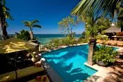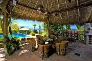 The pool area is the focal point of the villa. The tropical bar and grill is the perfect setting for entertaining, just steps above a large sandy beach with a protected cove for swimming.