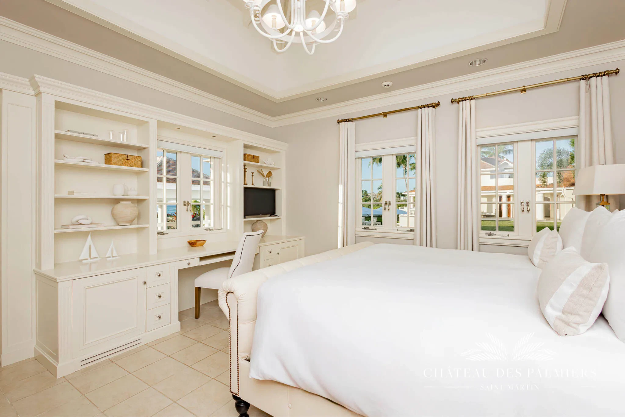 Le Chateau des Palmiers is a world-class beachfront estate that includes a 6-bedroom ocean side villa and a 4-bedroom garden side villa. Situated on the white sand beach at Plum Bay, this fabulous property provides an intimate, relaxed and attentive environment within the walls of a gated enclave. The many amenities include a huge heated pool, an open air and air conditioned fitness center, a tennis court, and covered outdoor bar, billiards and dining areas. The ocean side villa features 5 King Size bedrooms with full private baths including a two-story master suite with a master bath with Jacuzzi tub and two private balconies facing the pool & ocean. The remaining interior spaces include a fully equipped kitchen, a formal living room, a formal dining room seating 10 and a casual outside dining area and a media room. The 5 bedroom garden side villa features 3 king bedrooms and a 2 bedroom Suite with queen size beds, a shared living room and cozy dining room . There is also a huge commercial catering kitchen. Other amenities include air conditioning in all rooms, an outdoor sound system and internet access. All Bedrooms have independent DSS TV receiver & VCR, the Media Room and Master Bedroom have large satellite dish & DSS. Enjoy the beautiful Caribbean sunsets from your own private pool.