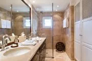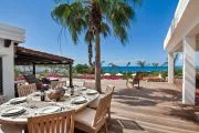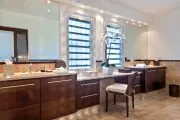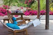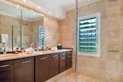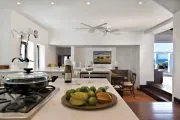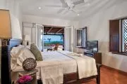 There are four bedrooms. Two are in private casitas off the upper deck. Spacious and comfortable, each room’s décor is a blend of serene whites and tans mixed with dark wood. Charming Spanish style shutters create privacy. Both casita bedrooms have sea and garden views as well as private patios. The gorgeous spa style bathrooms, with walk in showers, are designed in travertine accented with dark woods. Two additional bedrooms connect to the interior living space. It’s a wonderful set up for children. One room has bunk beds. The adjacent room has a king bed. The two share a spa style bathroom.