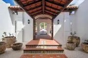 The interior great room, with terracotta floors and dark Spanish style vaulted ceilings, is cool, breezy and light. Pocket doors open to the view. Comfortable oversized seating in white and taupe against dark woods set an elegant, low-key atmosphere for lounging and dining. Spanish inspired doors and windows are featured thought out the house for an exotic touch. The well-equipped new kitchen is sleek and contemporary.