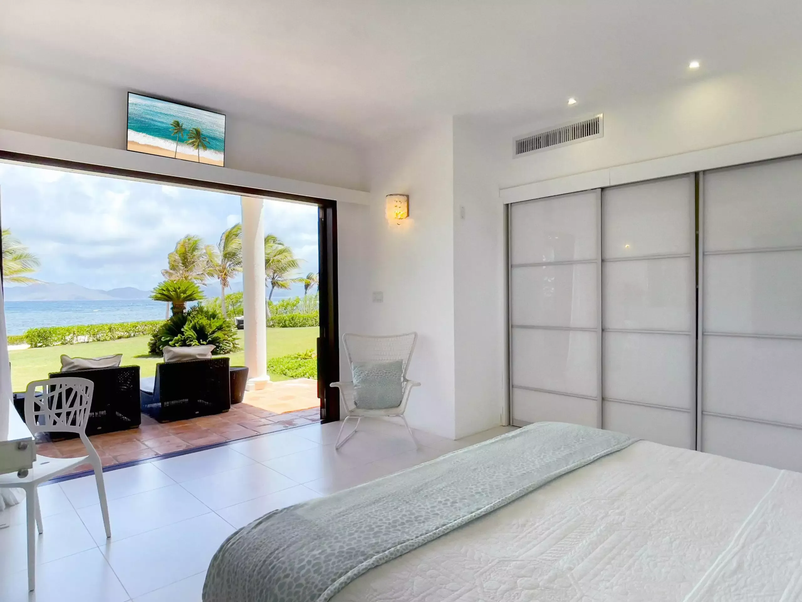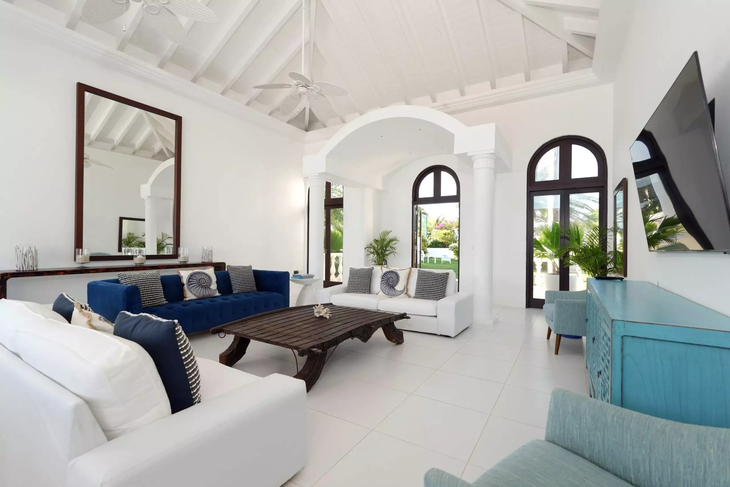 A spectacular entrance hall welcomes guests indoors to bright, airy spaces of understated elegance created by high ceilings, tall archways, indulgent soft furnishings, beautiful textiles and panoramic views of the islands beyond. Guests can relax in the spacious, elegant lounge that opens onto a magnificent terrace, with a superb contemporary kitchen.
