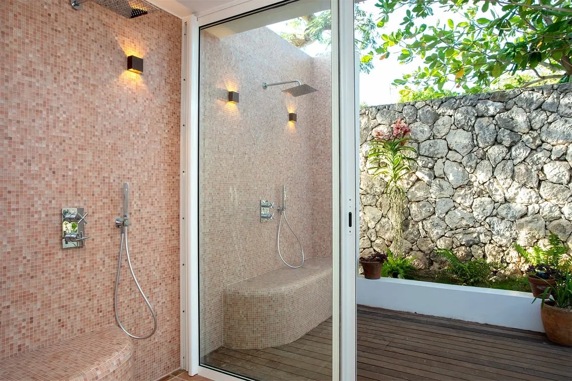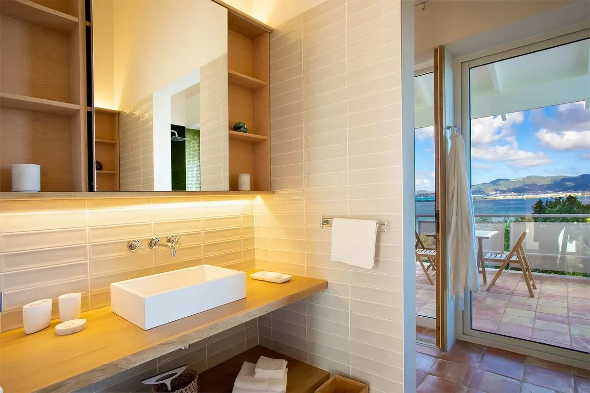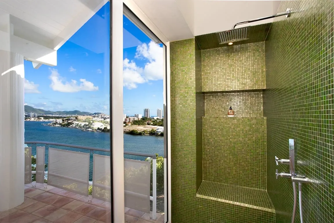 The view at night is just as sublime especially at full moon, shining over the water and the island coastline lights up. On the opposite side, the large floor-to-ceiling screen doors overlook the walled garden and open out to a covered dining terrace. The living space includes a TV viewing area with a large comfortable couch at one end and at the opposite end the bespoke light oak kitchen and white quartz-topped center island turn food prep into a convivial and social occasion. The interior space is completed by three bedrooms: two adjacent to the main living area with views across the water and a third bedroom to the rear of the house. The two bedrooms at the front of the house have floor-to-ceiling water views and beautiful bathrooms with iridescent Bisazza mosaic tile showers in greens and blues that reflect the view beyond. The third bedroom to the rear has its own lovely stone-walled garden, with an ornamental pool and fountain and a pergola seating area filled with tropical plants. The en-suite bathroom features an indoor shower as well as a beautiful open-air shower. Awaken your inner artist with a stay in this beautiful home. Villa Jasper with its unsurpassed surroundings and unique style will not disappoint!