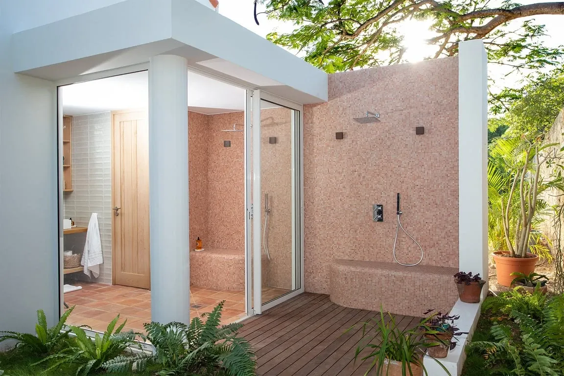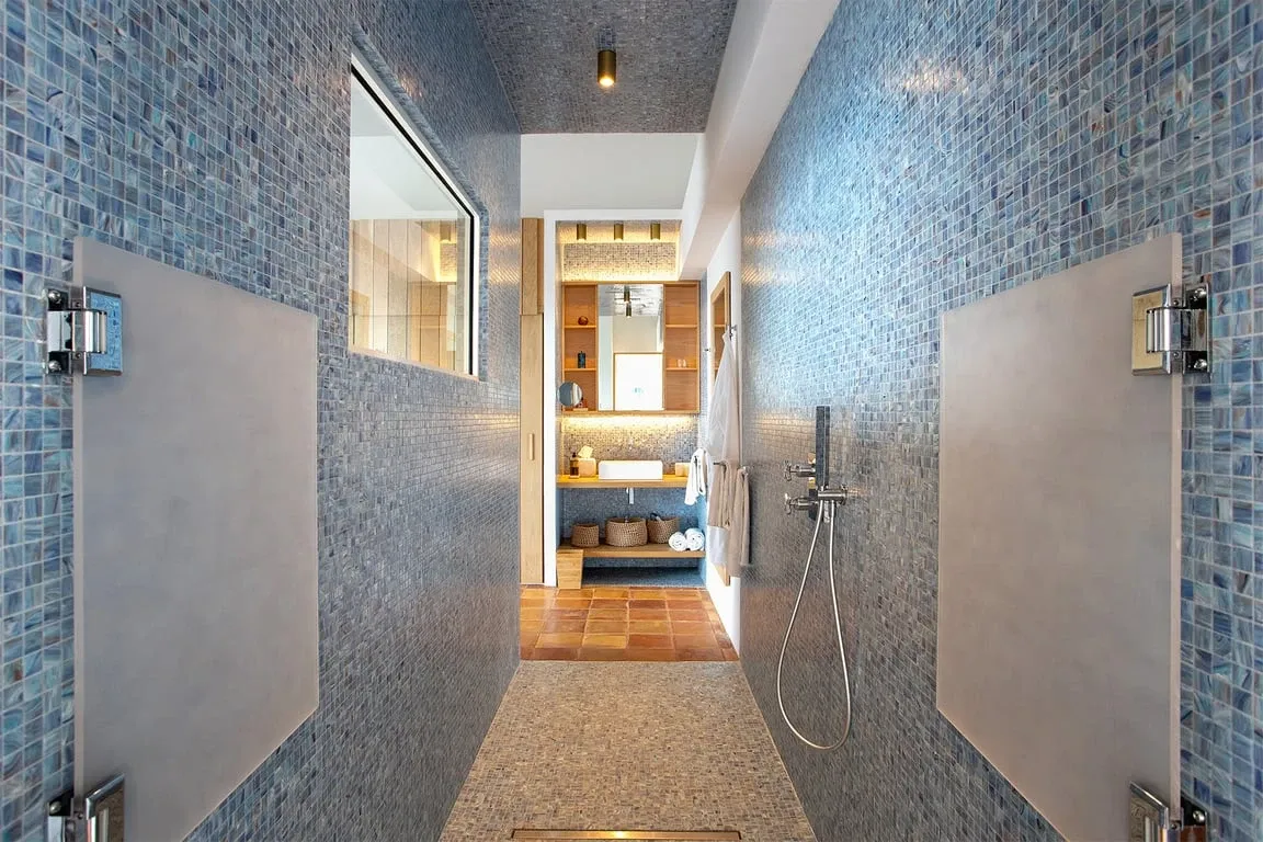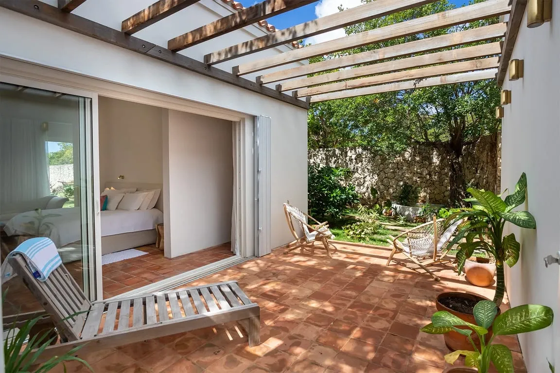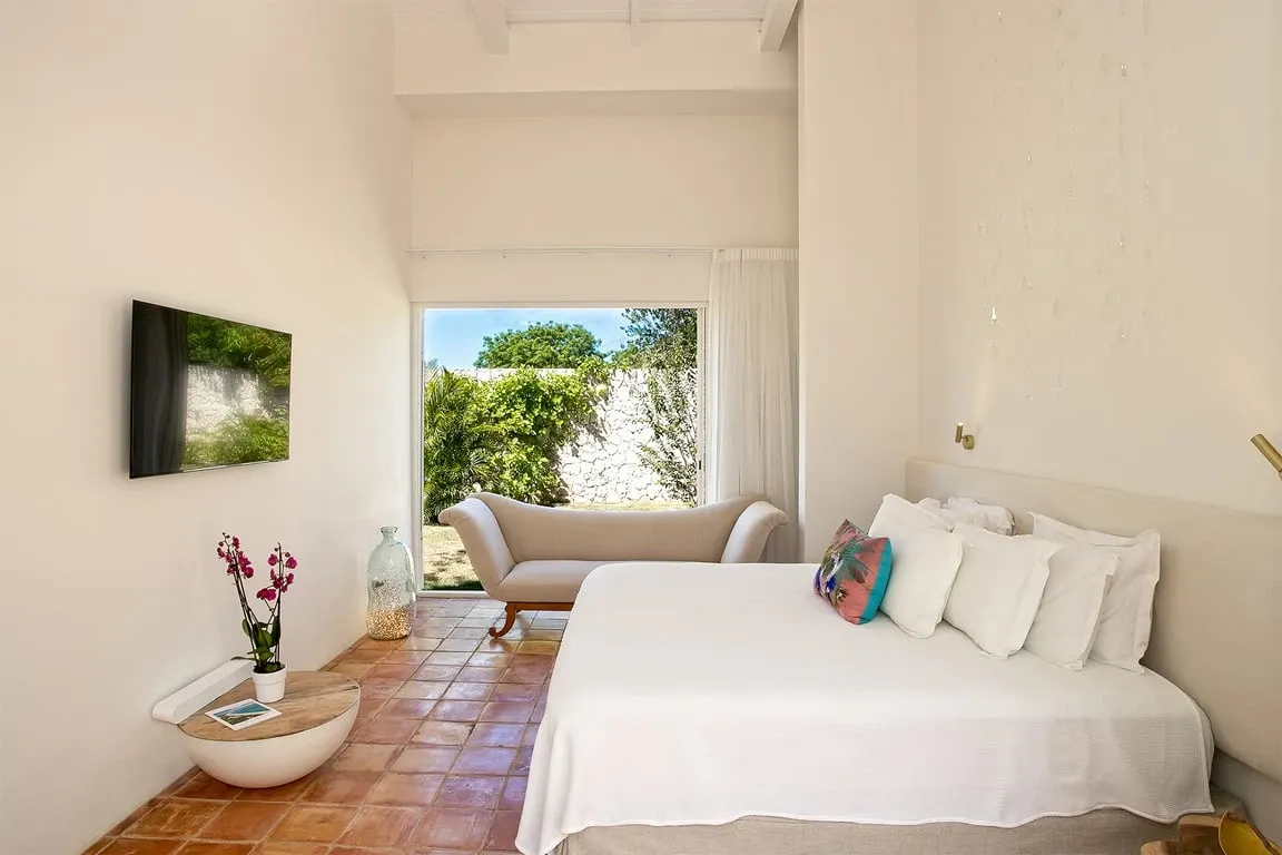 The view at night is just as sublime especially at full moon, shining over the water and the island coastline lights up. On the opposite side, the large floor-to-ceiling screen doors overlook the walled garden and open out to a covered dining terrace. The living space includes a TV viewing area with a large comfortable couch at one end and at the opposite end the bespoke light oak kitchen and white quartz-topped center island turn food prep into a convivial and social occasion. The interior space is completed by three bedrooms: two adjacent to the main living area with views across the water and a third bedroom to the rear of the house. The two bedrooms at the front of the house have floor-to-ceiling water views and beautiful bathrooms with iridescent Bisazza mosaic tile showers in greens and blues that reflect the view beyond. The third bedroom to the rear has its own lovely stone-walled garden, with an ornamental pool and fountain and a pergola seating area filled with tropical plants. The en-suite bathroom features an indoor shower as well as a beautiful open-air shower. Awaken your inner artist with a stay in this beautiful home. Villa Jasper with its unsurpassed surroundings and unique style will not disappoint!