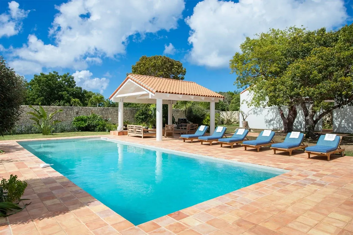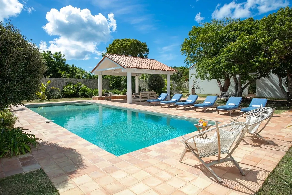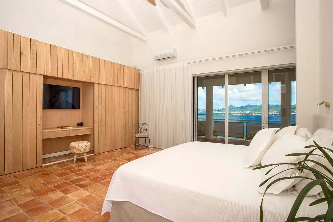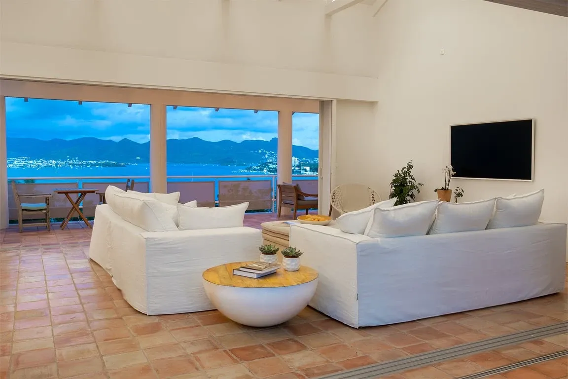 Situated in Terres Basses, right on the border between French and Dutch St Martin, the property rests high on the hillside enjoying sweeping water views across the scenic Simpson Bay Lagoon. Immersed in nature, surrounded by lush vegetation the house blends in effortlessly with the verdant landscape. White walls provide a perfect canvas for the silhouettes of the abundant vegetation and the warm tones of terra cotta create a beautiful contrast to the water and sky. Throughout the property, interesting perspectives are created using simple architectural lines and the natural stone walls and tree-lined pathways draw the eye to the stunning vistas beyond.