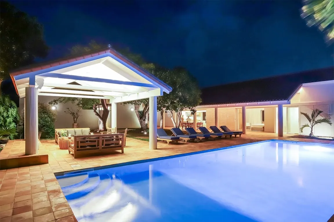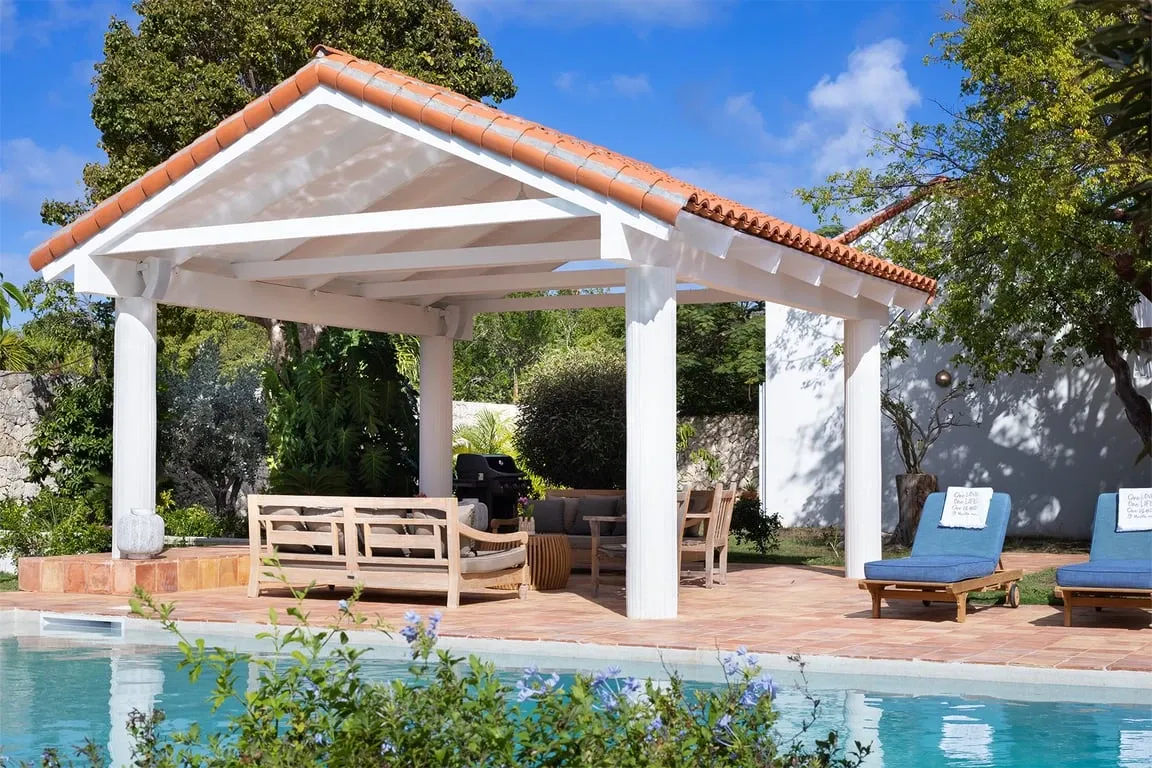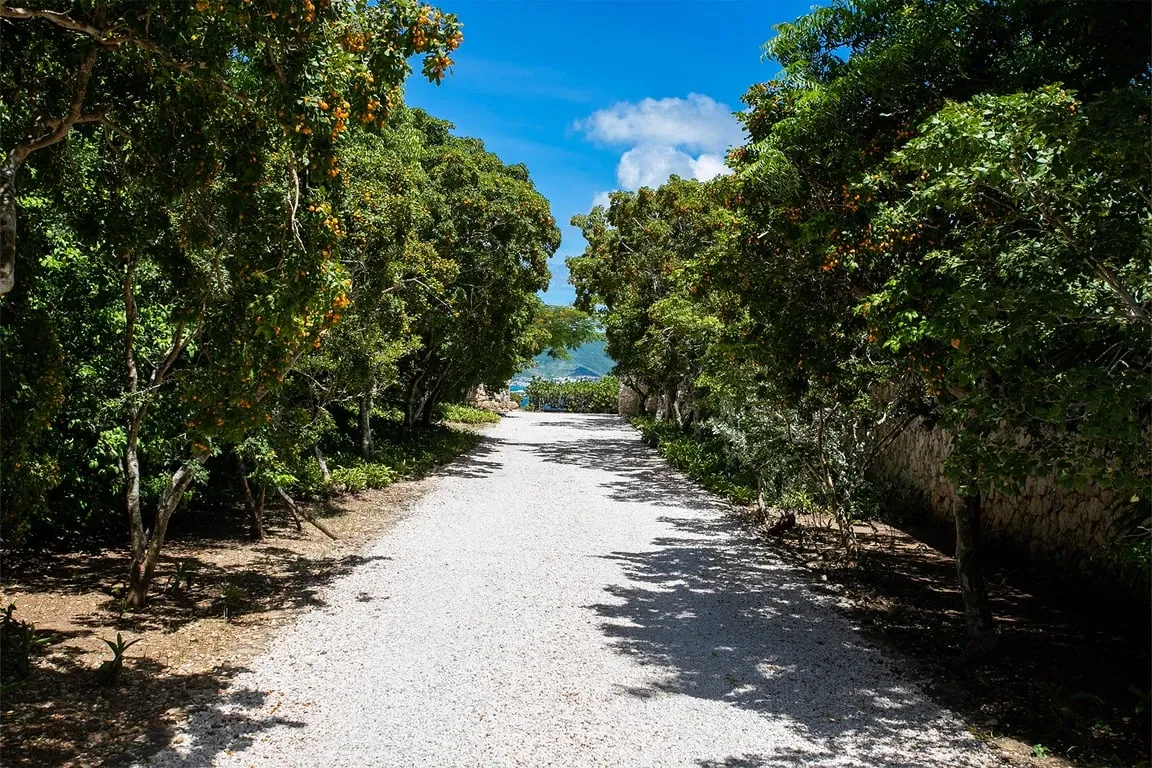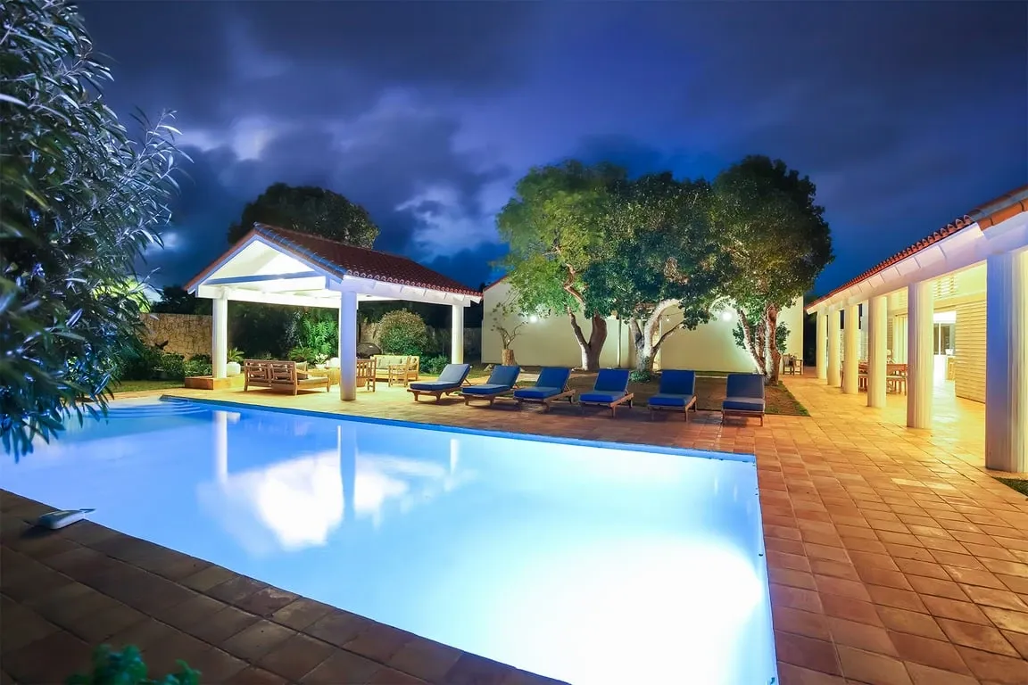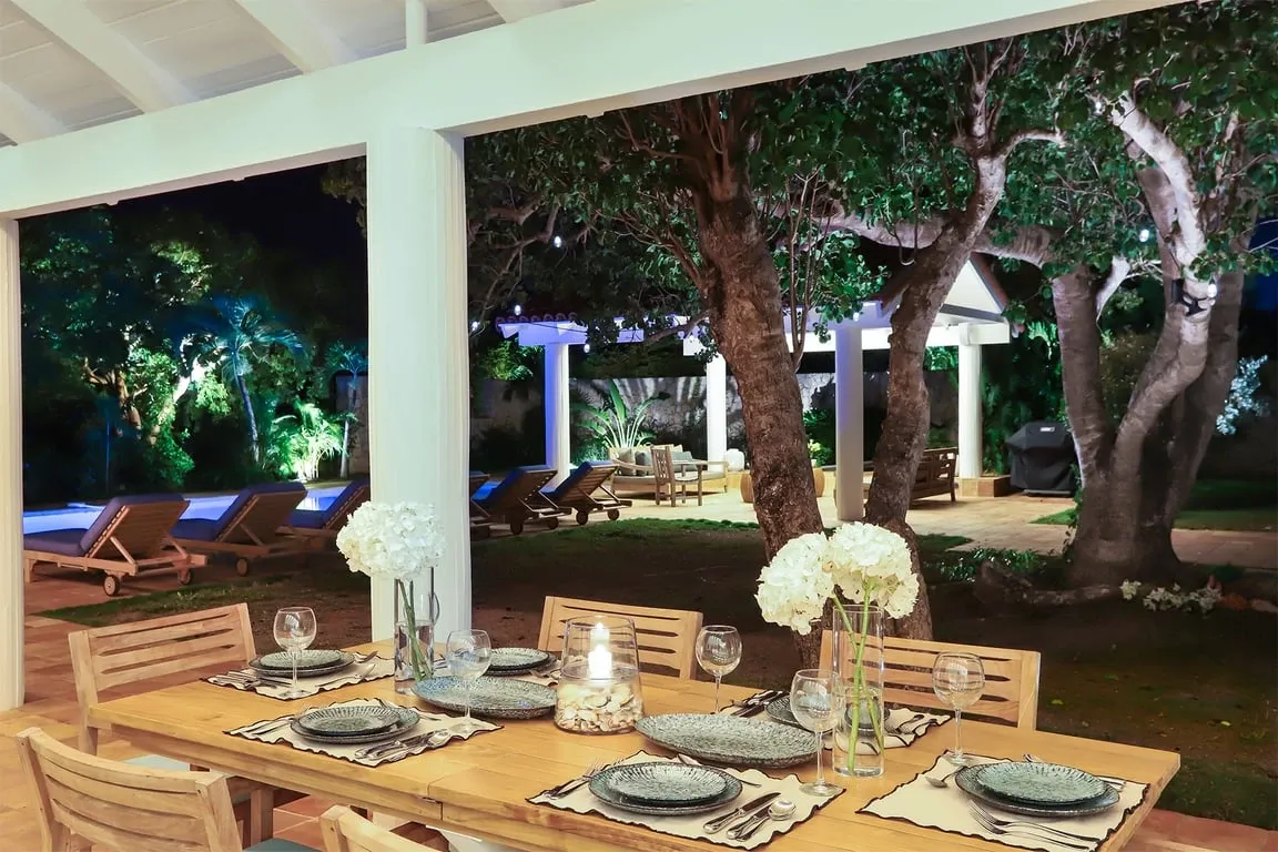 Situated in Terres Basses, right on the border between French and Dutch St Martin, the property rests high on the hillside enjoying sweeping water views across the scenic Simpson Bay Lagoon. Immersed in nature, surrounded by lush vegetation the house blends in effortlessly with the verdant landscape. White walls provide a perfect canvas for the silhouettes of the abundant vegetation and the warm tones of terra cotta create a beautiful contrast to the water and sky. Throughout the property, interesting perspectives are created using simple architectural lines and the natural stone walls and tree-lined pathways draw the eye to the stunning vistas beyond.