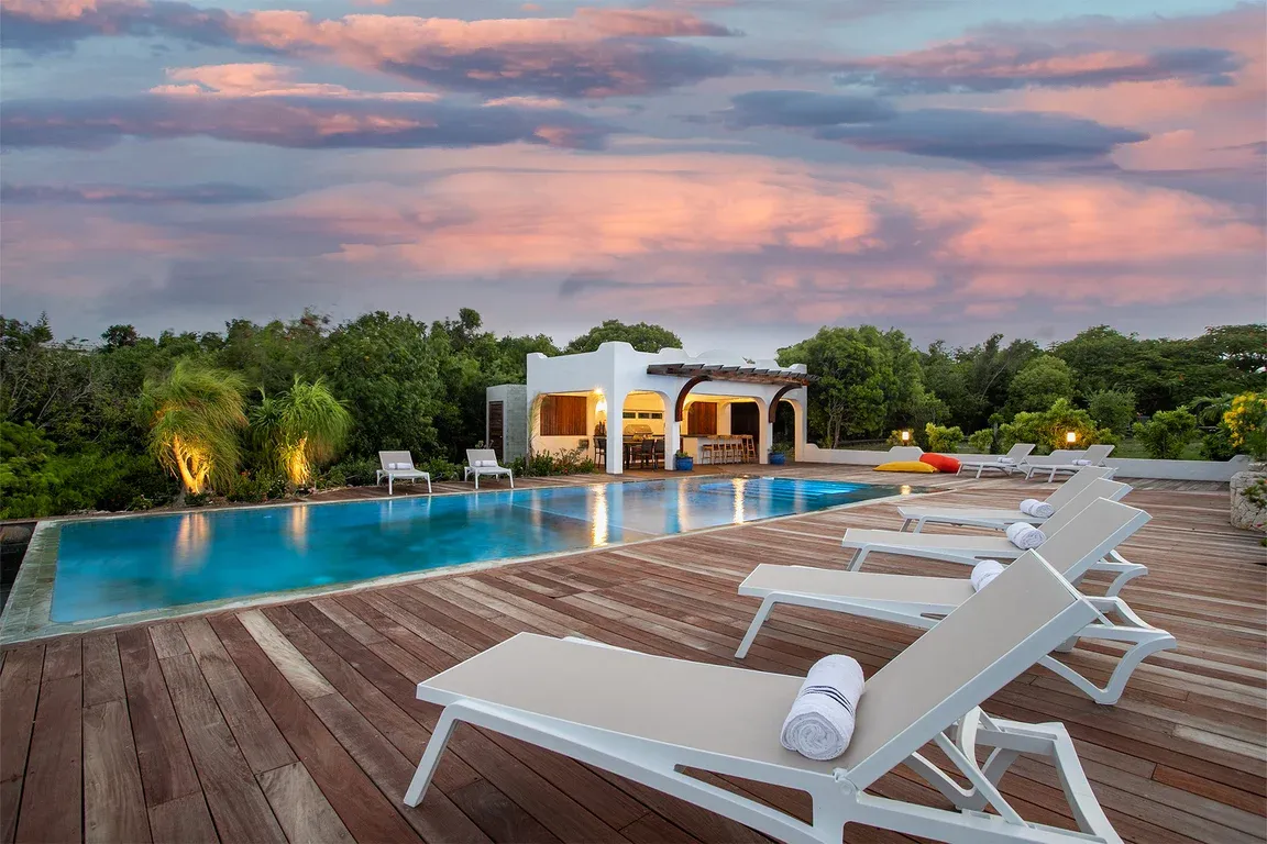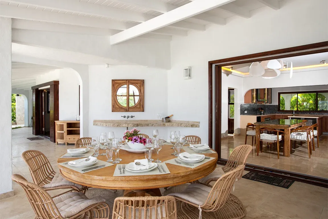 The exterior takes advantage of its prime positioning by highlighting Simpson Bay with an oval infinity heated pool acting as the stage for the view and a rectangular pool next to it; why have one pool when there could be two? A separate set of stepping stones, leading from the driveway, extends to an outdoor kitchen that is situated next to the rectangular pool. This creates the perfect place for hosting an event, while separate from the main villa. The kitchen includes a barbeque, a breakfast bar and a dining table beneath a dome structure acting as a culinary cocoon from the sun. Adjacent to this structure is a hidden alcove for reading a book or sparking conversation among friends. A concealed flight of steps, between the pools, leads visitors to a viewing area in which they can observe the sunset while sipping champagne. The additional outdoor dining table is located closer to the home, suited for cooking a casual meal or perhaps hiring a private chef to further embrace the scenery.