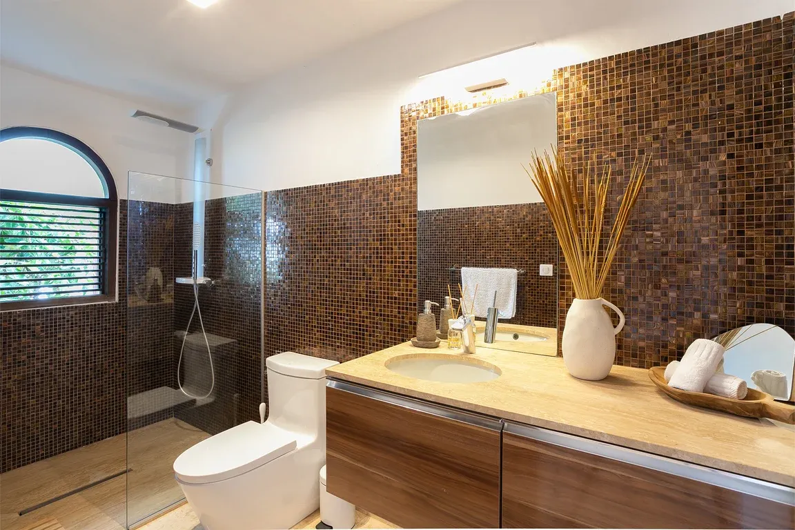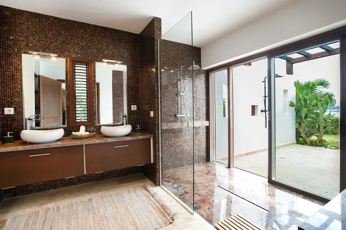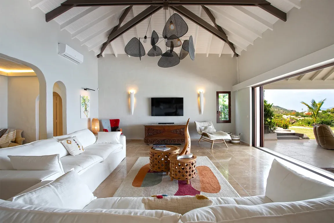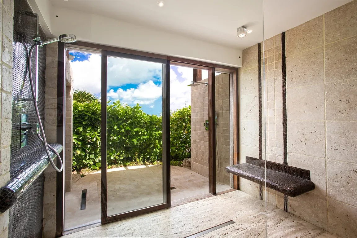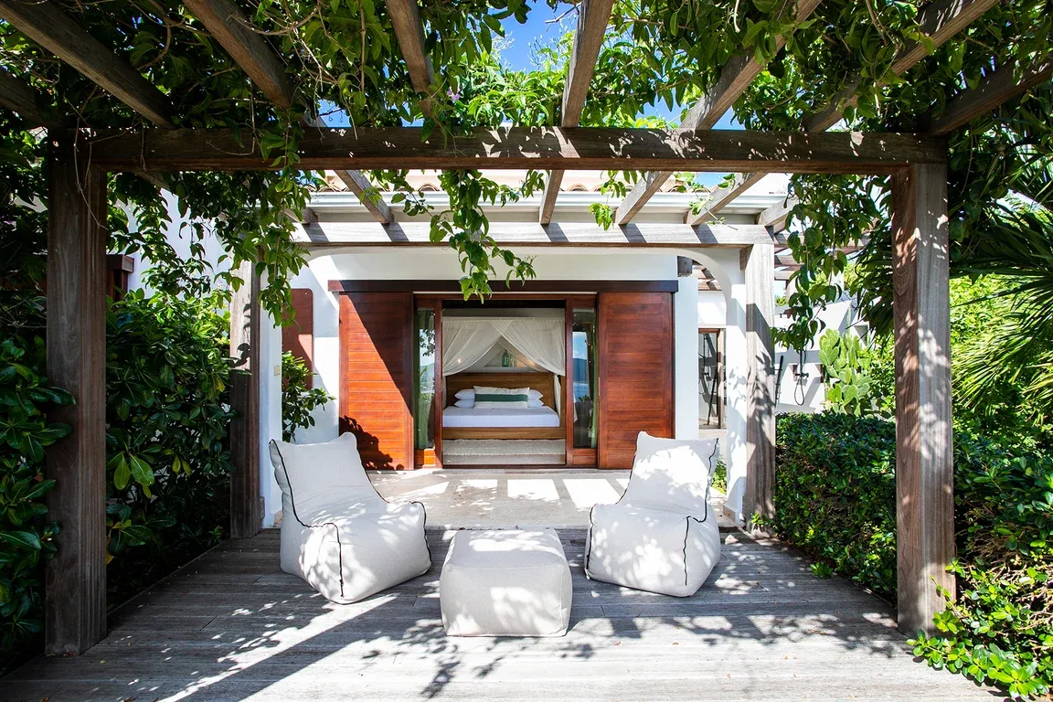 The three bedrooms stem from the heart of the home, with one room having an exterior entrance and the other two attached to the property itself. The rooms feature king-size beds, spectacular en-suites, and an individual outdoor terrace with spacious closets to store clothes in. The primary bedroom has interior and exterior access with a vast ensuite bathroom that includes a jacuzzi with a view, double sinks with harmonious mismatched tiles, and an indoor and outdoor shower for the preferred bathing method. All of the bedrooms include comfortable seating to unwind in the cosy atmosphere. The second bedroom is attached to the left of the living space and includes the main king-size bed with a niche set of bunkbeds for accommodating children in the home; for further details on this, contact St. Martin Sotheby’s Realty as this three-bedroom home could be adapted for additional clients. This bedroom also includes a private outdoor oasis with an arch of leaves around it. Lastly, the third bedroom is accessed through its exterior entrance near the front. By walking in, clients are faced with a mini set of stairs to the right, acting as an additional corner for children. Continuing further will reveal a low-laying bed with spectacular tall ceilings and an additional indoor and outdoor shower to fulfil the natural sense of this villa.