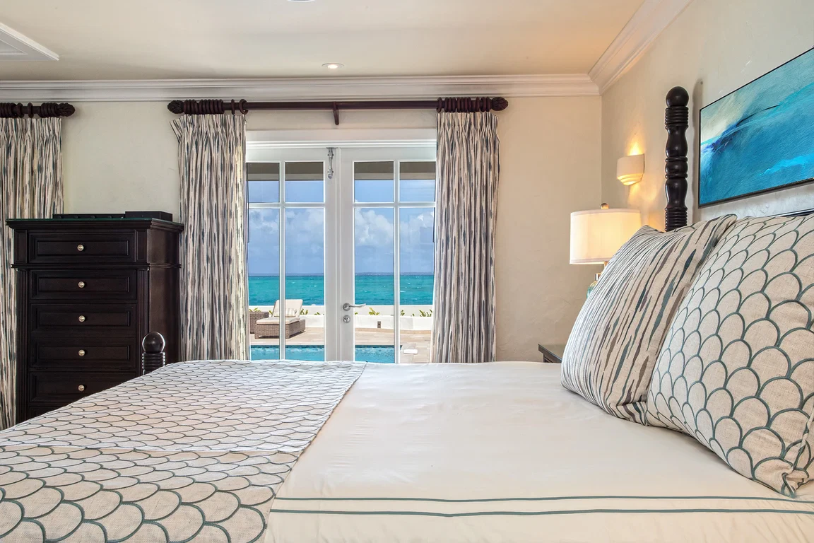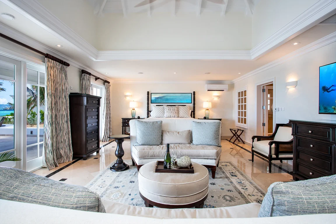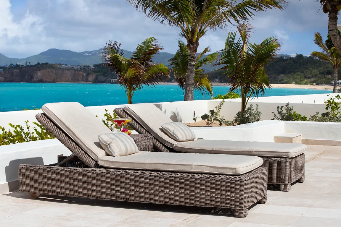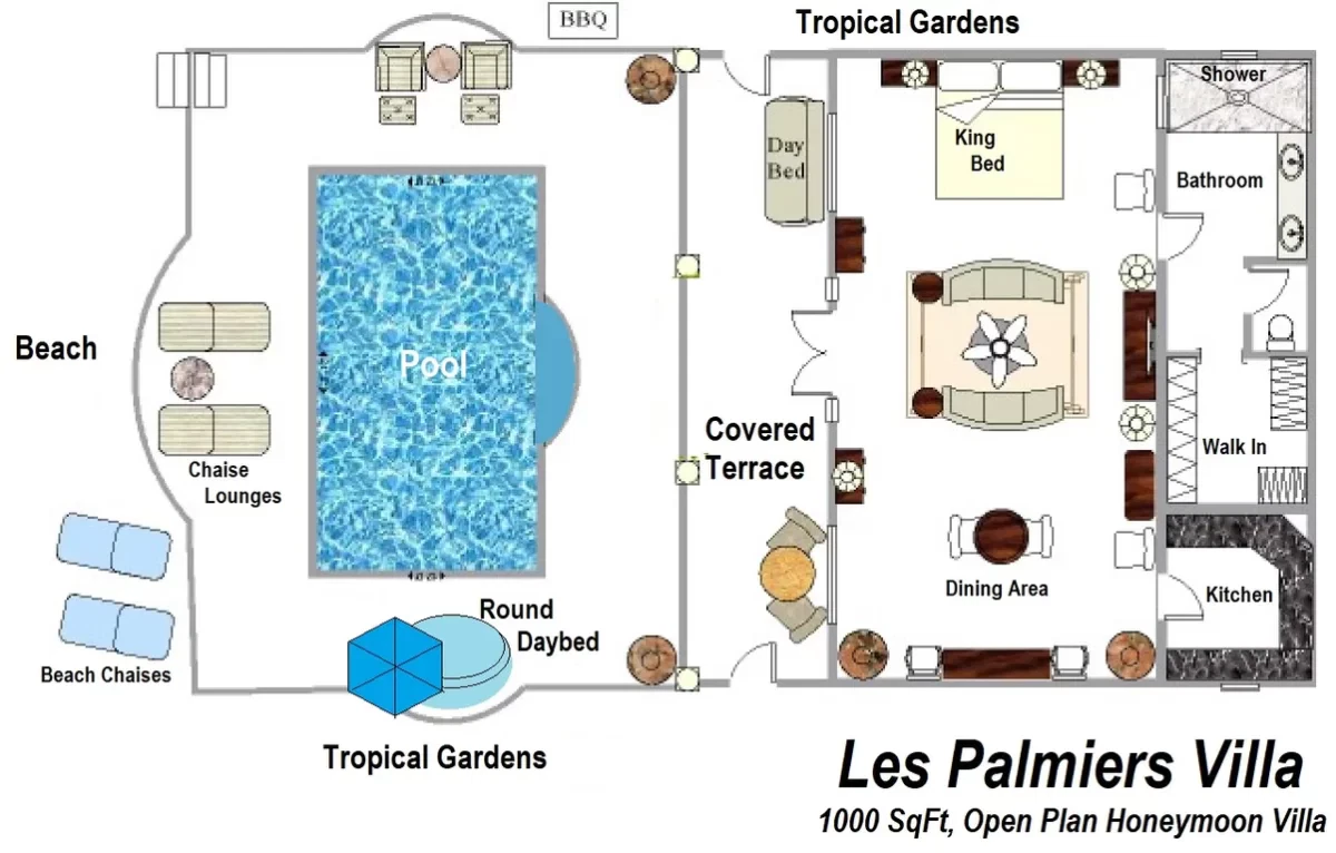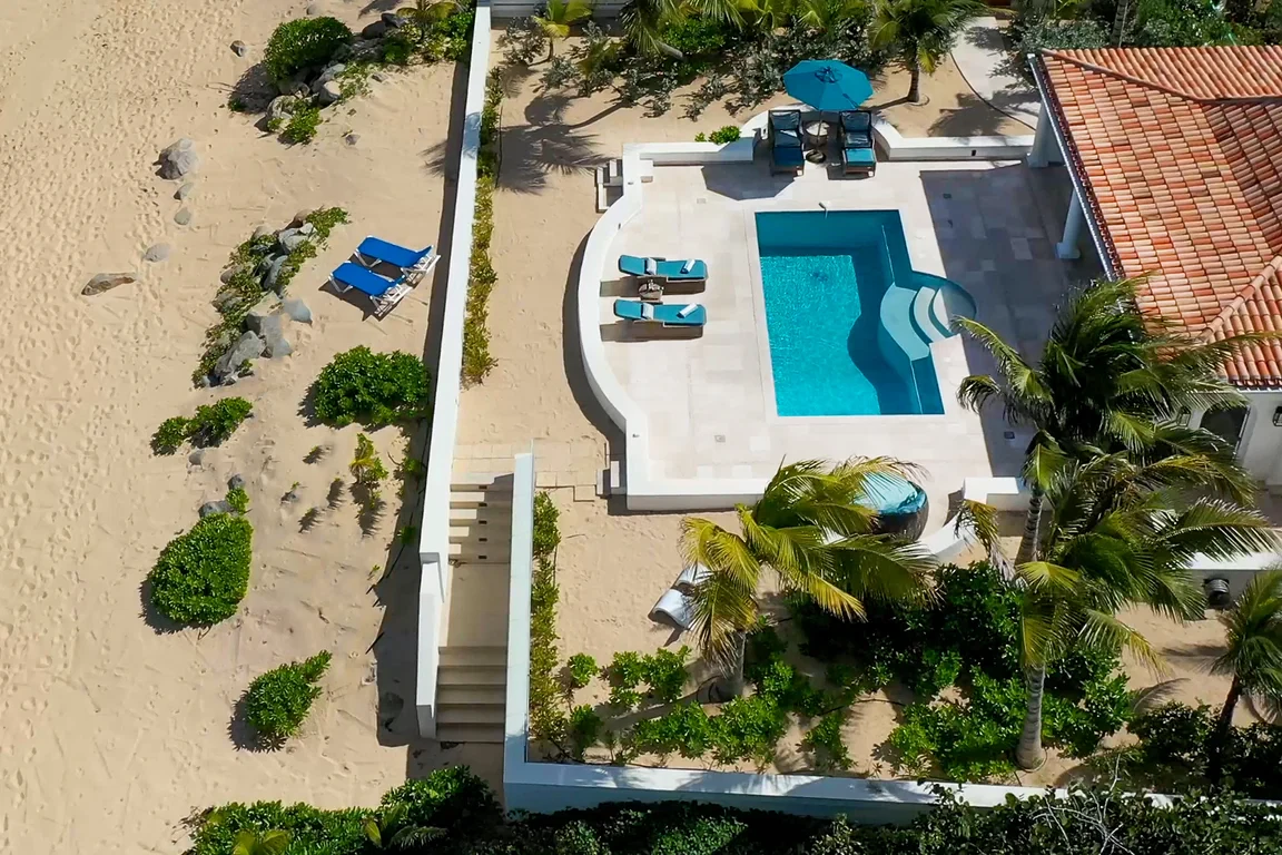 Les Palmiers lies nestled directly on the sands of the beautifully scenic Baie Rouge beach. Private and romantic, this one bedroom villa is the epitome of romance. Featured in numerous travel magazines, including the cover of Conde Nast Traveler, Les Palmiers is the perfect retreat for honeymoons, anniversaries and amorous get-aways. “A Day in Paradise at Les Palmiers” Arrival – The tropical turquoise entrance gate will open to a paved driveway surrounded by groves of palm trees and gardens of colorful, tropical flowers. A marble stairway will lead you up to the terrace where you’ll be entranced by the stunning, panoramic seascape. Here you will enter the beautifully suite-designed villa. Les Palmiers, decorated in soft tones of cream, blues and grays encompasses fully air conditioned sleeping, living and dining areas, all with spectacular ocean views. Dawn – Wake in the beautiful four poster bed featuring a plush W Hotel king size mattress enrobed in luxurious bed linens. Glimpse the first blush of sunrise through the 21 feet of glass French doors. Feel pampered in the spacious ensuite bath featuring a large open shower with beautiful marble mosaics, a marble topped vanity with two sinks, make-up mirror, walk in closet and resort towels. Midday – As the day warms up, you’ll be mesmerized by the everchanging blue hues in the ocean as it laps on the sandy shores just steps from the terrace. Spend the day enjoying dips in the private, refreshing mosaic glass trimmed pool or sunning on comfortable loungers either poolside on the marble terrace or on the sandy beach. Sunset – As the sun sets, cudlle up on the comfy daybed with cocktails and soft music playing throughout the villa and terrace. Watch as the Caribbean presents its amazing show of dazzling colors starring sunset and sea. Evening – Whenever you’re hungry make use of the fully equipped kitchen or outdoor BBQ to prepare meals or book a private chef. The chef can prepare romantic, gourmet, candlelit dinners to be enjoyed at the beautiful stone mosaic dining table on the terrace, serenaded by the calming sound of the sea. Or dine out in one of St. Martin’s many romantic restaurants with fabulous food – there are plenty to choose from! Night – The sky darkens and the silver moon shimmers on the sea. Take a romantic walk on the sandy beach with the stars twinkling aglow in the sky. Look for sea turtles coming ashore to lay their eggs as Baie Rouge has been designated a sea turtle reserve. Les Palmiers is certainly the most romantic place in St. Martin, a perfect “Lovers retreat”. This is a no smoking house, and this house does not accept pets.