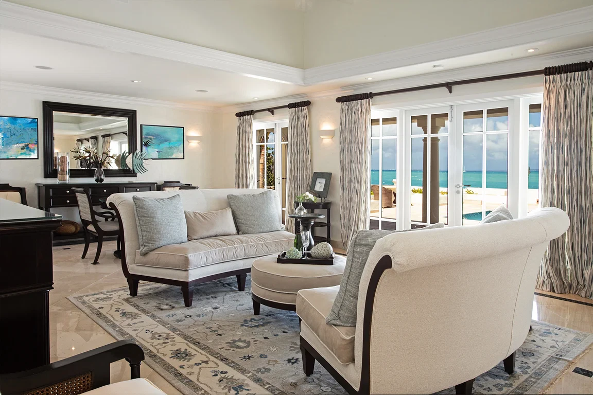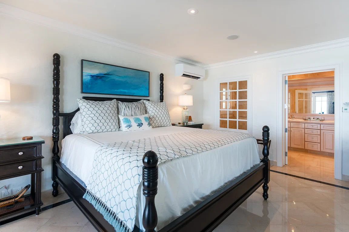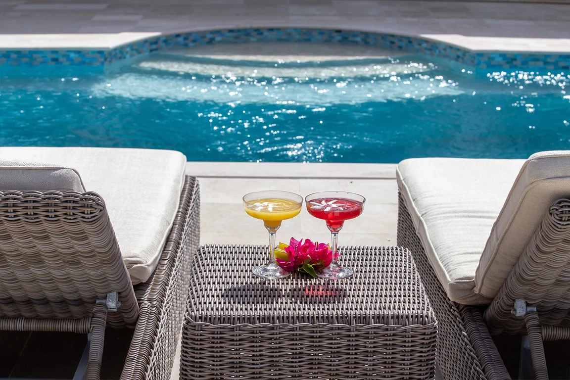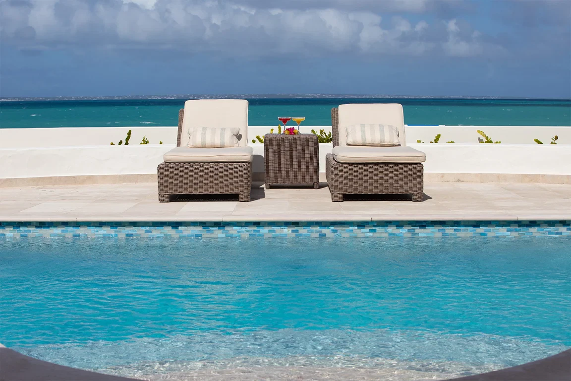 Les Palmiers lies nestled directly on the sands of the beautifully scenic Baie Rouge beach. Private and romantic, this one bedroom villa is the epitome of romance. Featured in numerous travel magazines, including the cover of Conde Nast Traveler, Les Palmiers is the perfect retreat for honeymoons, anniversaries and amorous get-aways. “A Day in Paradise at Les Palmiers” Arrival – The tropical turquoise entrance gate will open to a paved driveway surrounded by groves of palm trees and gardens of colorful, tropical flowers. A marble stairway will lead you up to the terrace where you’ll be entranced by the stunning, panoramic seascape. Here you will enter the beautifully suite-designed villa. Les Palmiers, decorated in soft tones of cream, blues and grays encompasses fully air conditioned sleeping, living and dining areas, all with spectacular ocean views. Dawn – Wake in the beautiful four poster bed featuring a plush W Hotel king size mattress enrobed in luxurious bed linens. Glimpse the first blush of sunrise through the 21 feet of glass French doors. Feel pampered in the spacious ensuite bath featuring a large open shower with beautiful marble mosaics, a marble topped vanity with two sinks, make-up mirror, walk in closet and resort towels. Midday – As the day warms up, you’ll be mesmerized by the everchanging blue hues in the ocean as it laps on the sandy shores just steps from the terrace. Spend the day enjoying dips in the private, refreshing mosaic glass trimmed pool or sunning on comfortable loungers either poolside on the marble terrace or on the sandy beach. Sunset – As the sun sets, cudlle up on the comfy daybed with cocktails and soft music playing throughout the villa and terrace. Watch as the Caribbean presents its amazing show of dazzling colors starring sunset and sea. Evening – Whenever you’re hungry make use of the fully equipped kitchen or outdoor BBQ to prepare meals or book a private chef. The chef can prepare romantic, gourmet, candlelit dinners to be enjoyed at the beautiful stone mosaic dining table on the terrace, serenaded by the calming sound of the sea. Or dine out in one of St. Martin’s many romantic restaurants with fabulous food – there are plenty to choose from! Night – The sky darkens and the silver moon shimmers on the sea. Take a romantic walk on the sandy beach with the stars twinkling aglow in the sky. Look for sea turtles coming ashore to lay their eggs as Baie Rouge has been designated a sea turtle reserve. Les Palmiers is certainly the most romantic place in St. Martin, a perfect “Lovers retreat”. This is a no smoking house, and this house does not accept pets.