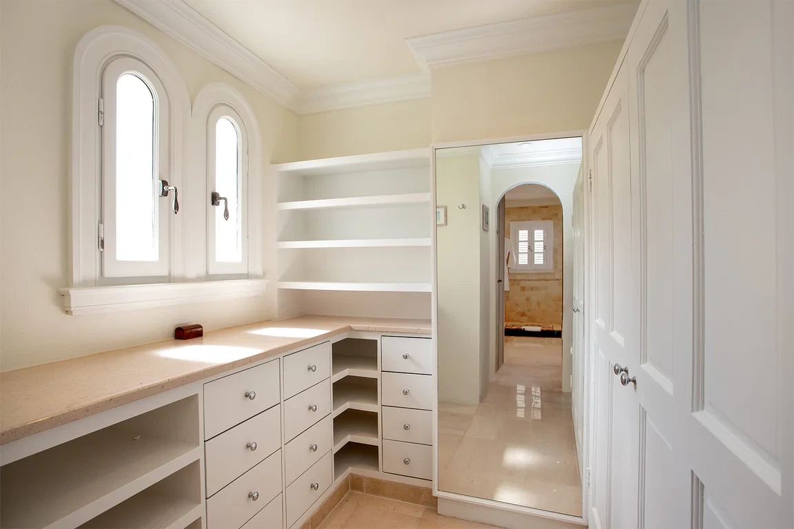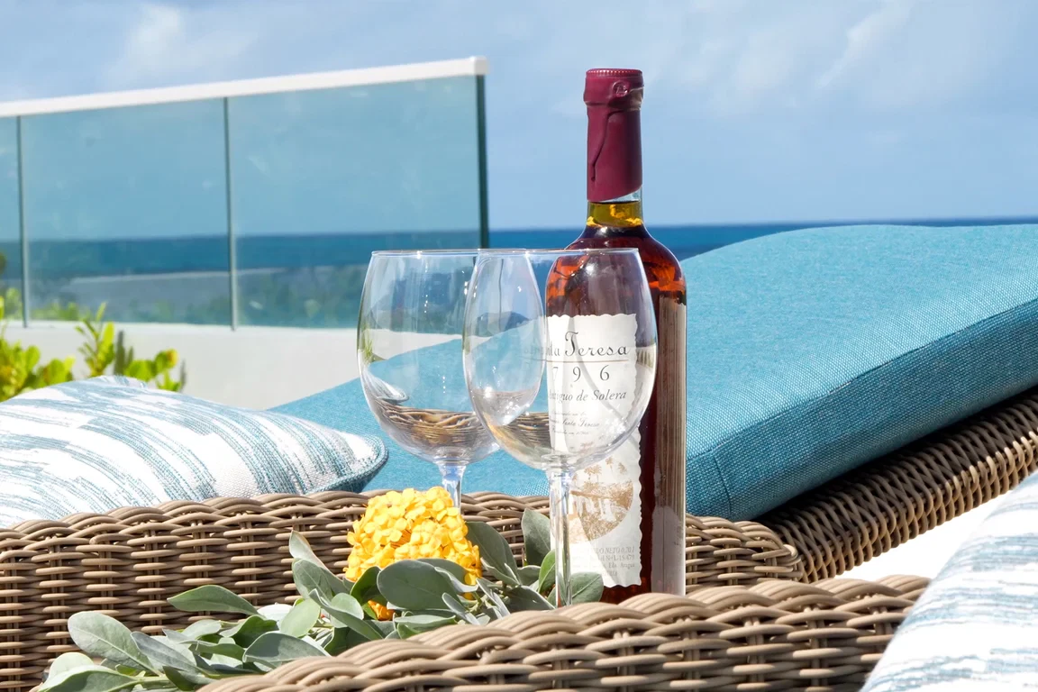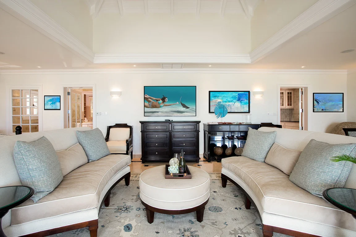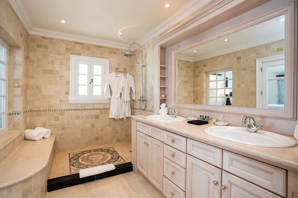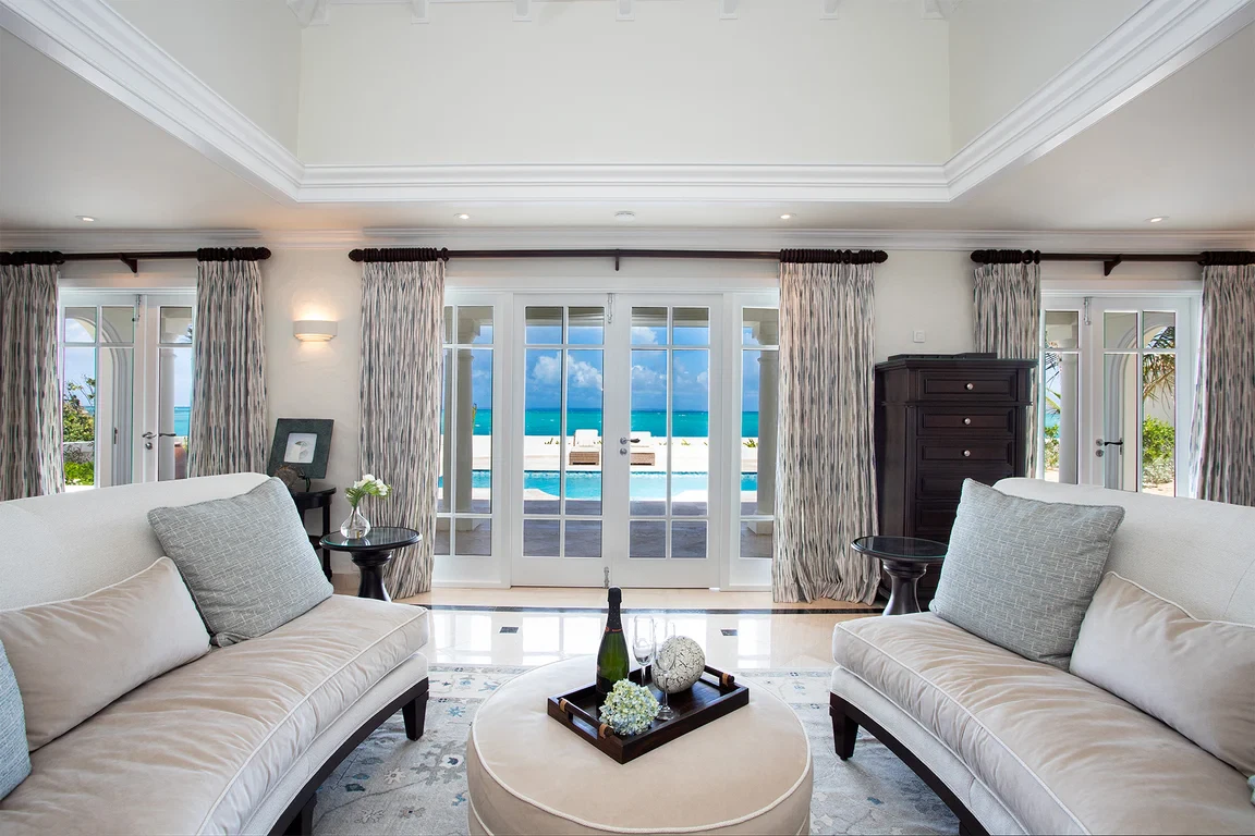 Les Palmiers lies nestled directly on the sands of the beautifully scenic Baie Rouge beach. Private and romantic, this one bedroom villa is the epitome of romance. Featured in numerous travel magazines, including the cover of Conde Nast Traveler, Les Palmiers is the perfect retreat for honeymoons, anniversaries and amorous get-aways. “A Day in Paradise at Les Palmiers” Arrival – The tropical turquoise entrance gate will open to a paved driveway surrounded by groves of palm trees and gardens of colorful, tropical flowers. A marble stairway will lead you up to the terrace where you’ll be entranced by the stunning, panoramic seascape. Here you will enter the beautifully suite-designed villa. Les Palmiers, decorated in soft tones of cream, blues and grays encompasses fully air conditioned sleeping, living and dining areas, all with spectacular ocean views. Dawn – Wake in the beautiful four poster bed featuring a plush W Hotel king size mattress enrobed in luxurious bed linens. Glimpse the first blush of sunrise through the 21 feet of glass French doors. Feel pampered in the spacious ensuite bath featuring a large open shower with beautiful marble mosaics, a marble topped vanity with two sinks, make-up mirror, walk in closet and resort towels. Midday – As the day warms up, you’ll be mesmerized by the everchanging blue hues in the ocean as it laps on the sandy shores just steps from the terrace. Spend the day enjoying dips in the private, refreshing mosaic glass trimmed pool or sunning on comfortable loungers either poolside on the marble terrace or on the sandy beach. Sunset – As the sun sets, cudlle up on the comfy daybed with cocktails and soft music playing throughout the villa and terrace. Watch as the Caribbean presents its amazing show of dazzling colors starring sunset and sea. Evening – Whenever you’re hungry make use of the fully equipped kitchen or outdoor BBQ to prepare meals or book a private chef. The chef can prepare romantic, gourmet, candlelit dinners to be enjoyed at the beautiful stone mosaic dining table on the terrace, serenaded by the calming sound of the sea. Or dine out in one of St. Martin’s many romantic restaurants with fabulous food – there are plenty to choose from! Night – The sky darkens and the silver moon shimmers on the sea. Take a romantic walk on the sandy beach with the stars twinkling aglow in the sky. Look for sea turtles coming ashore to lay their eggs as Baie Rouge has been designated a sea turtle reserve. Les Palmiers is certainly the most romantic place in St. Martin, a perfect “Lovers retreat”. This is a no smoking house, and this house does not accept pets.