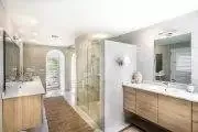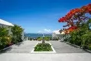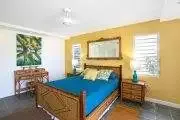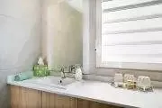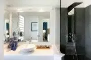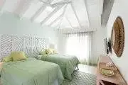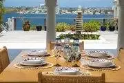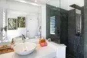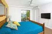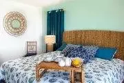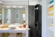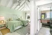 Each of the five bedrooms, independent from the main living areas are accessed from the exterior and follow the natural slope of the property. Two bedrooms are situated on the main level and are accessed from the courtyard including the brand new master bedroom with its relaxing beige and white décor, ample closet space, and its own terrace overlooking the lagoon and gardens. The en-suite bathroom features a glass-walled shower, double vanities, and a separate toilet and bidet. Next to the master is a twin bedroom and en-suite bathroom decorated in cool mint green and overlooking the garden. A few steps down from the main level are two further bedrooms both with king-size beds, one featuring a colorful jungle décor and the other a marine blue and seashell theme. Both rooms have small terraces and walk-in closets and en-suite bathrooms with slate grey tiled open showers. The final fifth bedroom is on a lower level and has a king-size bed, a terrace overlooking the garden and an en-suite bathroom with an open shower. All five bedrooms are air-conditioned and have ceiling fans and Smart TV’s