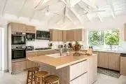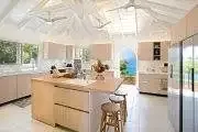 Leading off the living area is a large and welcoming kitchen with light wood cabinetry, a central island, double sinks, and Bosch appliances including two large refrigerators, an oven and a microwave, and a Siemens gas cooktop. A stone pathway lined with cashew trees leads from the kitchen to a delightful octagonal breakfast gazebo overlooking the sea and the beach of Baie Rouge just below.