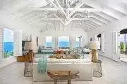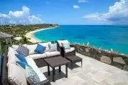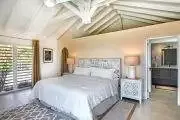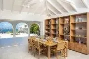 A lovely fountained courtyard greets you at the main entrance and an arched opening leads through to Libellule’s huge high-ceilinged living area lined with traditional Caribbean shutters. A wonderful respite from the daytime heat this lovely room features cool limestone flooring, several ceiling fans, comfortable seating and dining area, and benefits from the cooling trade winds that blow off the sea. At the far end, shuttered doors open to a fabulous seafront terrace with the spectacular backdrop of the Caribbean and the island of Anguilla in the distance. The terrace provides a comfortable lounging area and a covered patio for al fresco dining.