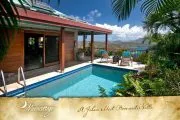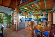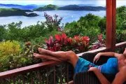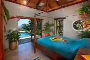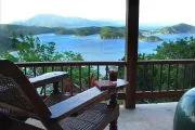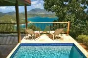 Utterly private and so romantic, Mooncottage will delight couples seeking a lovers’ hideaway and a secluded spot for vacationing. Tucked within lush gardens and set high on a green hill reached via a winding island road, Mooncottage commands one of the best views on St. John – a sweeping 180-degree blue and green panorama of Coral Bay, Tortola, Norman Island and Virgin Gorda. A stone staircase ushers you into the soothing zen magic of Mooncottage: two pavilions crafted in native stonework bordered by a graveled garden courtyard set with a bubbling koi pond, and connected by a heated pool, with an adjacent covered verandah overlooking the endless Caribbean horizon. The Main House is tastefully done with upholstered sofas and chairs, is accented with teak and other exotic hardwoods, and shares space with the colorful gourmet kitchen and a full bath with a moon window. The restful aura of this pavilion is completed by the shaded porch just outside, which beckons relaxation. Adjacent is the master bedroom pavilion with an outside shower, queen bed and full bath. The architecture, Feng Shui, eclectic furnishings and this villa’s very serene and spiritual ambience are simplicity itself, but exceptional in so many ways. Superbly equipped, Mooncottage offers many excellent amenities, including satellite internet access for your laptop and complimentary welcome gifts for all guests. Set on a half acre of natural Caribbean beauty, Mooncottage is exactly the right size, totally private, fully screened and graced with lovely gardens, banana, papaya, mampoo and flowering Chapeau Napoleon trees. Its high elevation and constant island tradewinds assure cool comfort, and it offers tranquility and closeness to nature, with turtle doves cooing, surf whispering below and night skies offering you the moon and a million stars. A short drive down the hill to Coral Bay puts you within minutes of bars, restaurants and beaches – but you may decide to stay at Mooncottage and just enjoy the peace, the view and each other. Unique and exceptional.
