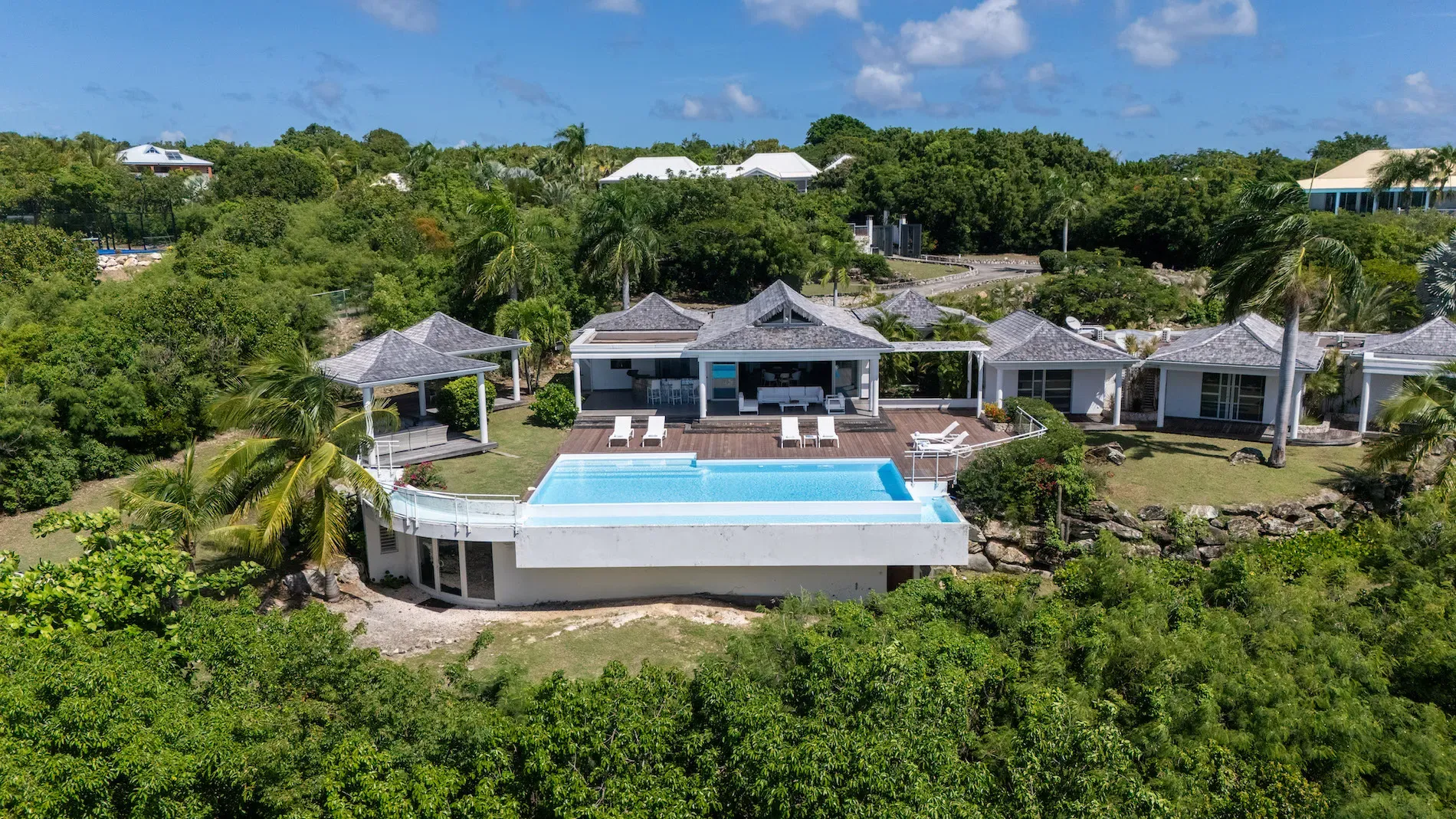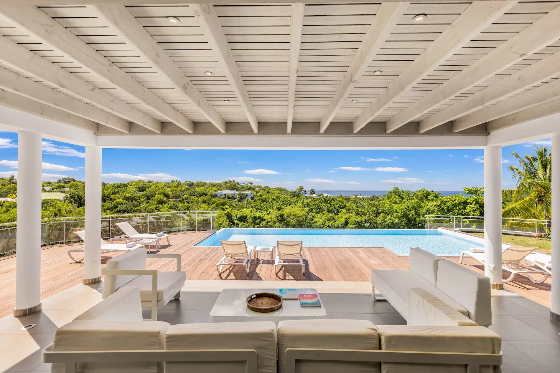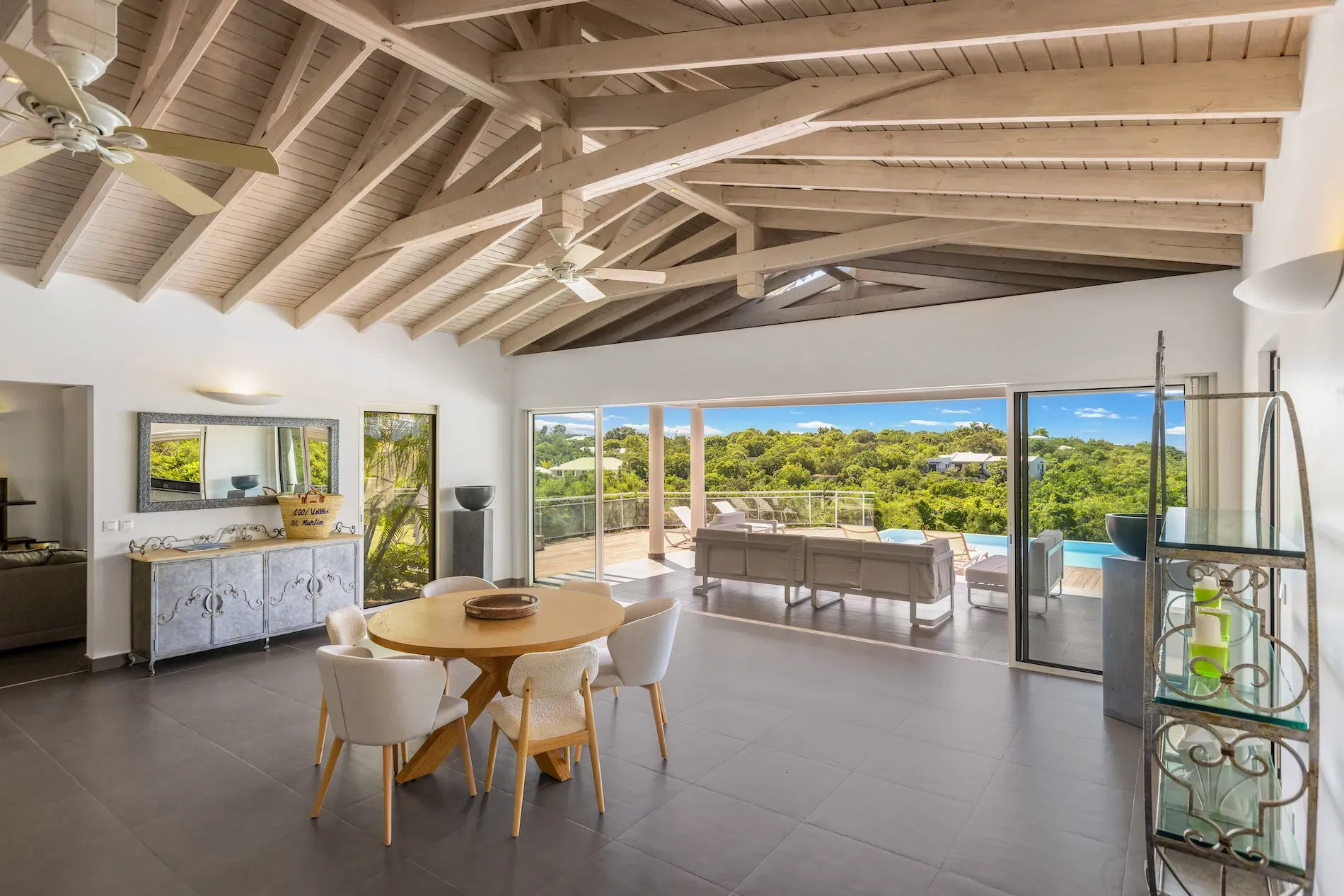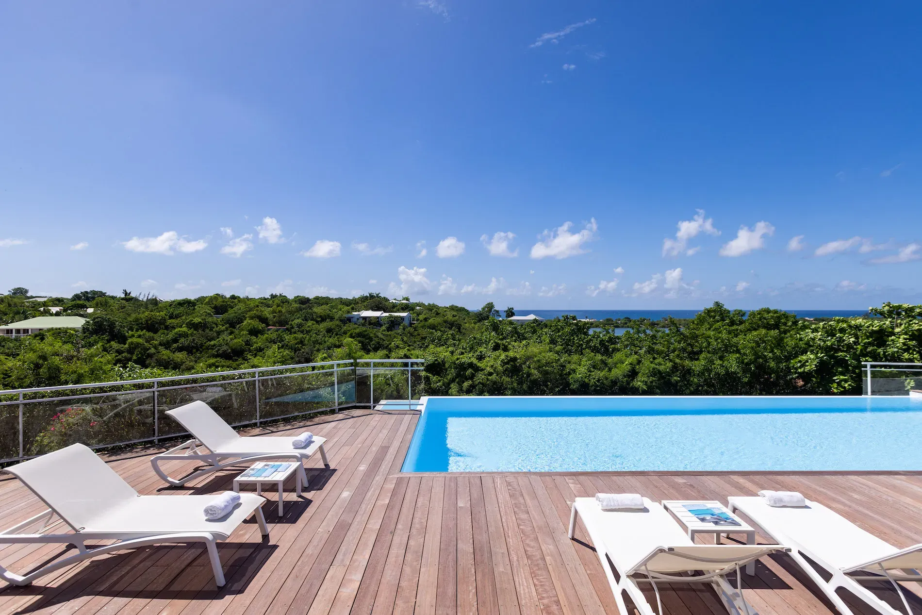 The property offers 3 equal bedrooms with their ensuite bathrooms, a very well equipped kitchen, and an infinity pool facing the beautiful view of the sunset over Baie Longue and the Caribbean sea.