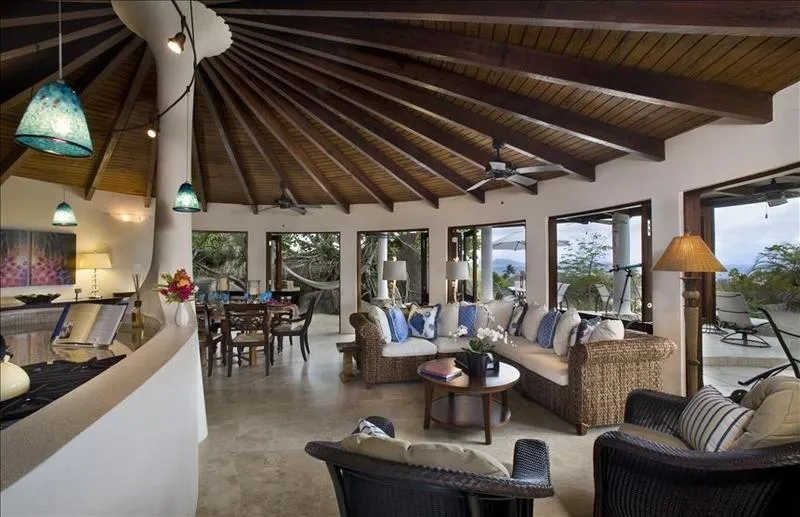 The living room is exquisitely appointed with a richly stained 14′ exposed beam ceiling, sea grass furniture, custom dining room table all accented in Caribbean colors. With its unique circular space, this room completely opens up to create an open air living environment which flows freely onto the pool terrace to take advantage of the beautiful views, ocean breezes and spectacular sunsets.