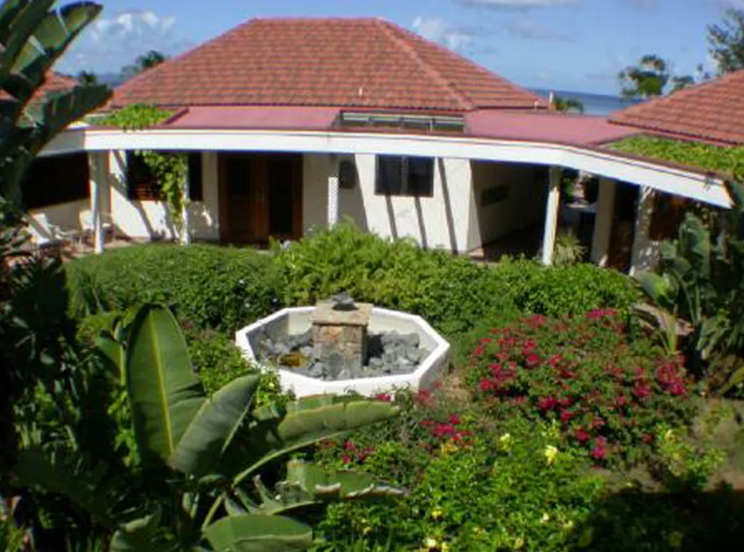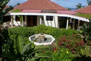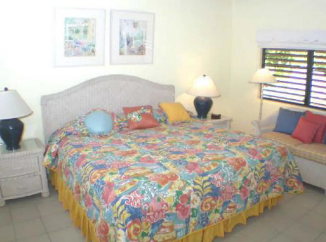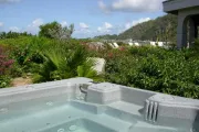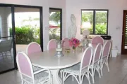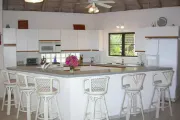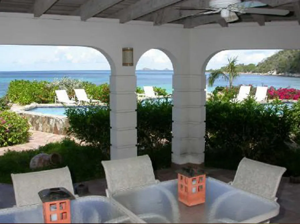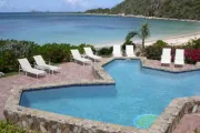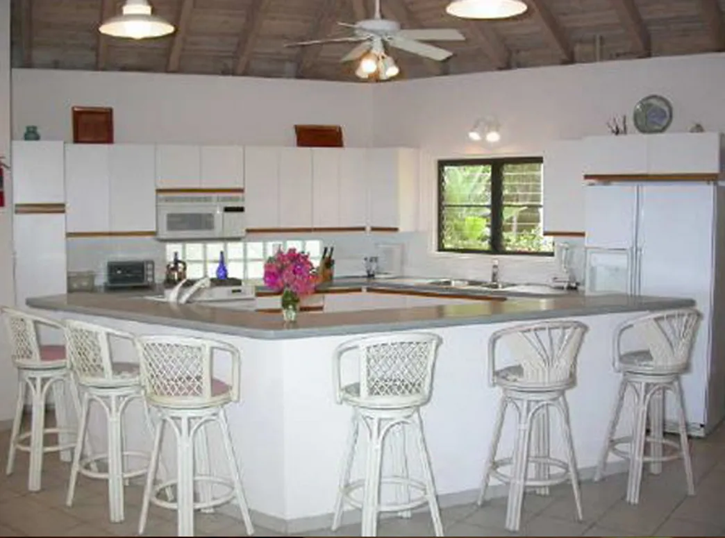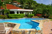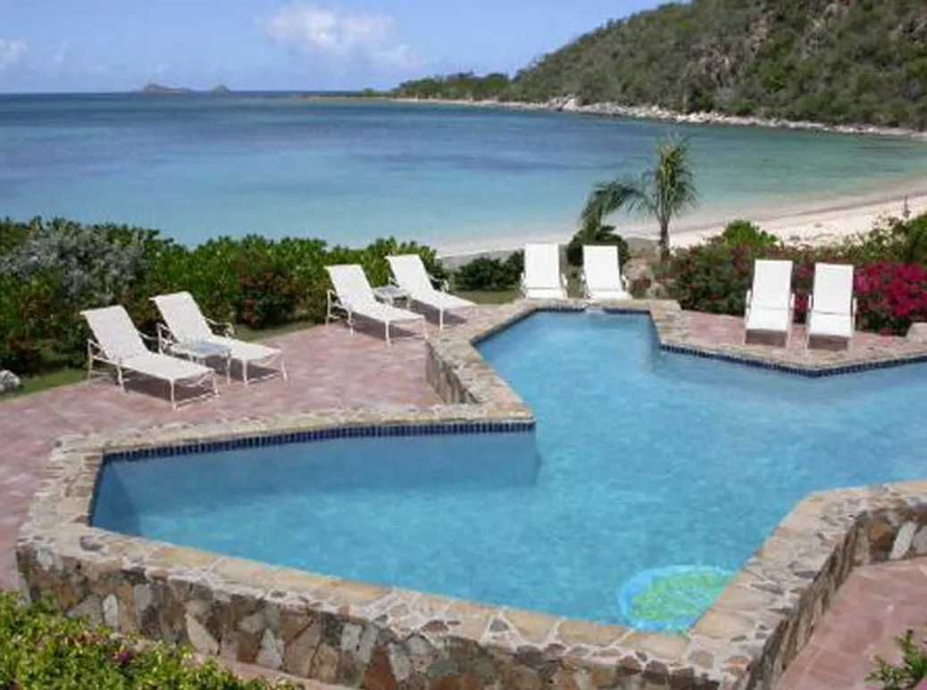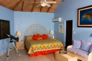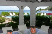 This lovely villa sits right on the edge of Mahoe Bay – white sand and aqua sea are but 15 feet from your private pool. Sandcastle’s Great Room, furnished in charming Caribbean style, combines living, dining and kitchen areas all under an airy cathedral ceiling; this spacious room opens out to a beachside covered verandah for alfresco dining and cocktails surrounded by lush gardens and is just steps from the pool. On one side of the Great Room is the air-conditioned master king suite with a hot tub in its front garden; on the other side in the breezeway is a wet bar with icemaker and mini-fridge. Just beyond the breezeway is Sandcastle’s north pavilion with the second and third air-conditioned king bedroom/bath suites, and across the garden courtyard and fountain is the fourth air-conditioned suite with two double beds. A separate two-storied pavilion sits at the east edge of the courtyard; stairs lead up to the fifth bedroom suite, which also doubles as a handsome office/library on the upper level offering satellite TV, a desk and fax machine, a game table, full bath, and a private covered balcony (this suite will be air-conditioned by fall, 2004). Elegant tropical furnishings, fabrics and Caribbean art and accessories create splashes of vibrant color against Sandcastle’s cool white tiles and white wicker for timeless casual comfort – this is the perfect location for a family beach holiday.