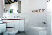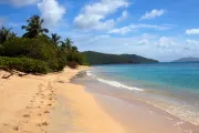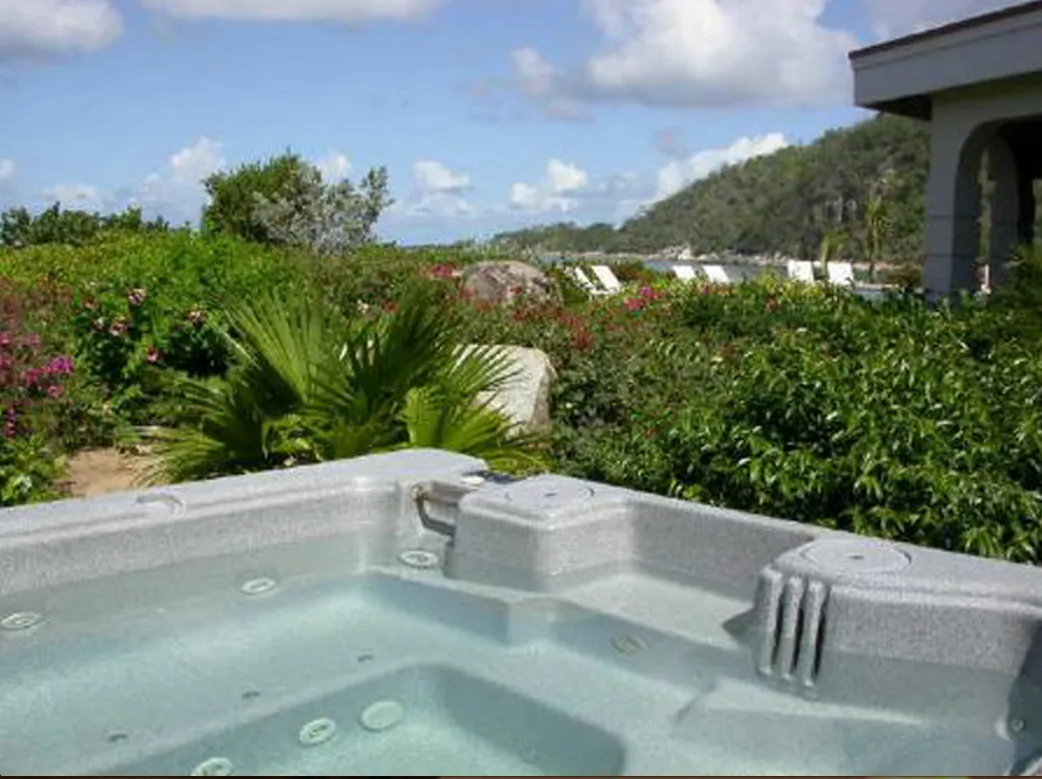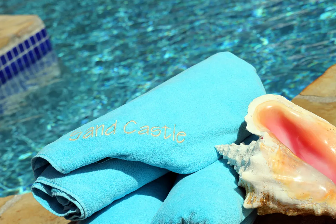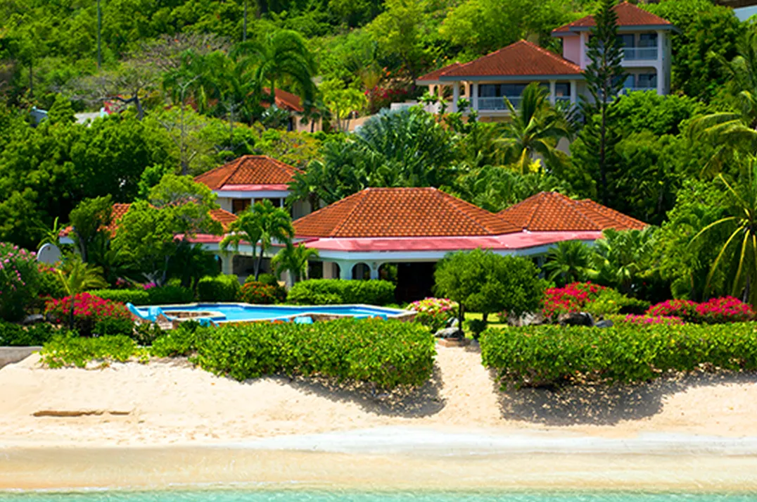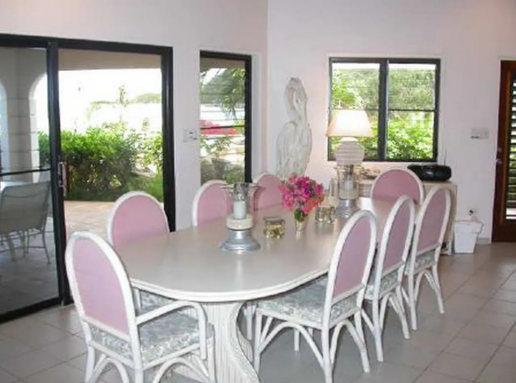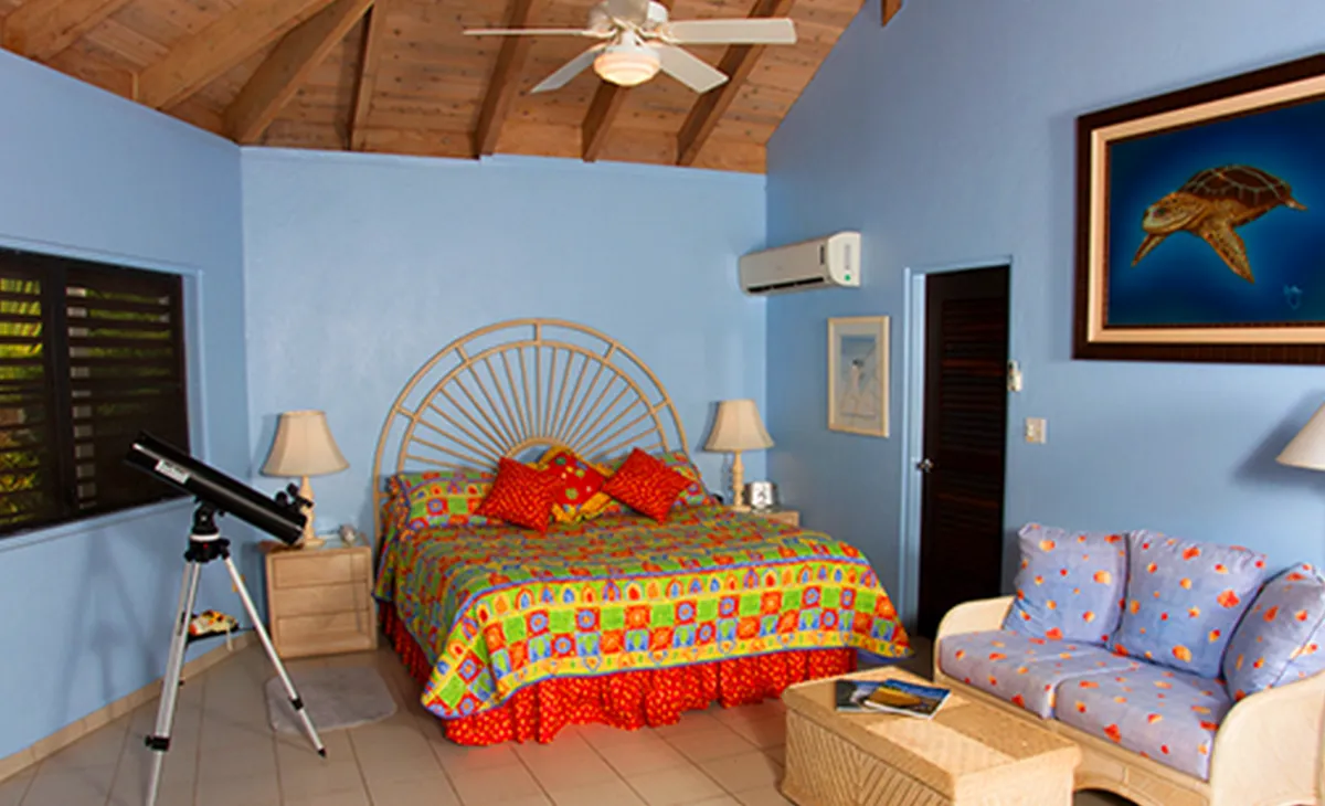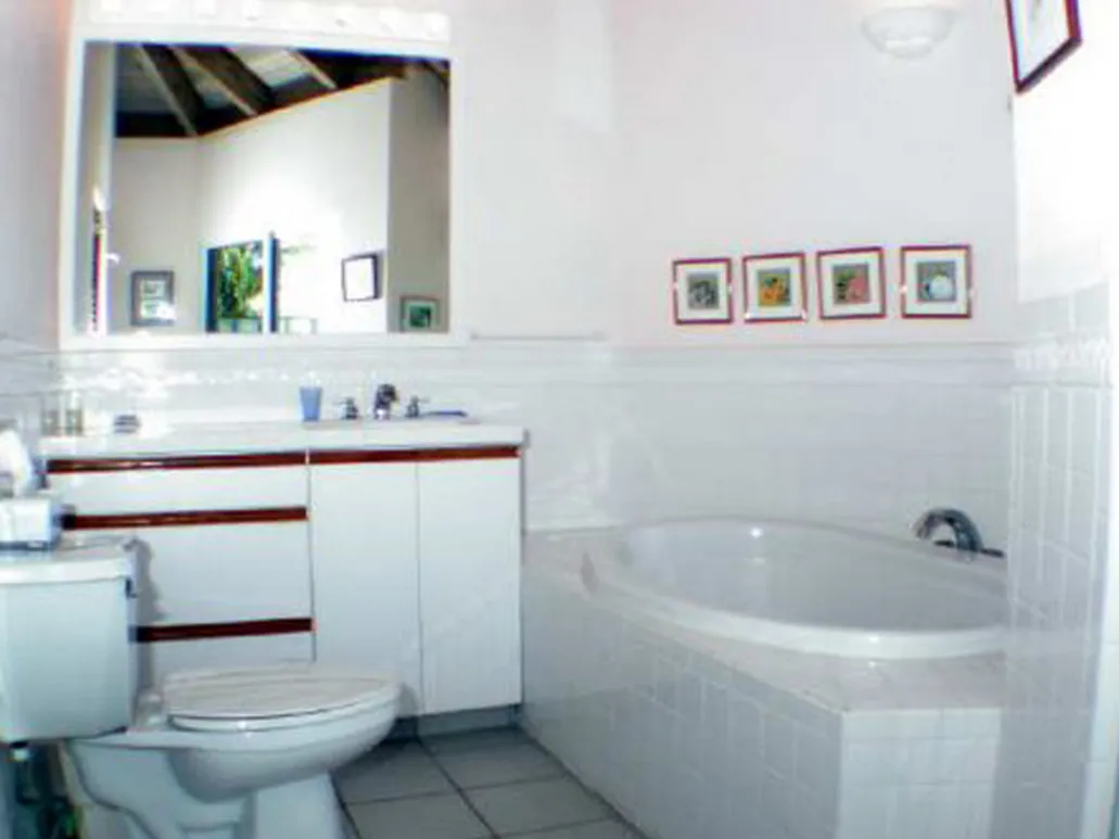 This lovely villa sits right on the edge of Mahoe Bay – white sand and aqua sea are but 15 feet from your private pool. Sandcastle’s Great Room, furnished in charming Caribbean style, combines living, dining and kitchen areas all under an airy cathedral ceiling; this spacious room opens out to a beachside covered verandah for alfresco dining and cocktails surrounded by lush gardens and is just steps from the pool. On one side of the Great Room is the air-conditioned master king suite with a hot tub in its front garden; on the other side in the breezeway is a wet bar with icemaker and mini-fridge. Just beyond the breezeway is Sandcastle’s north pavilion with the second and third air-conditioned king bedroom/bath suites, and across the garden courtyard and fountain is the fourth air-conditioned suite with two double beds. A separate two-storied pavilion sits at the east edge of the courtyard; stairs lead up to the fifth bedroom suite, which also doubles as a handsome office/library on the upper level offering satellite TV, a desk and fax machine, a game table, full bath, and a private covered balcony (this suite will be air-conditioned by fall, 2004). Elegant tropical furnishings, fabrics and Caribbean art and accessories create splashes of vibrant color against Sandcastle’s cool white tiles and white wicker for timeless casual comfort – this is the perfect location for a family beach holiday.