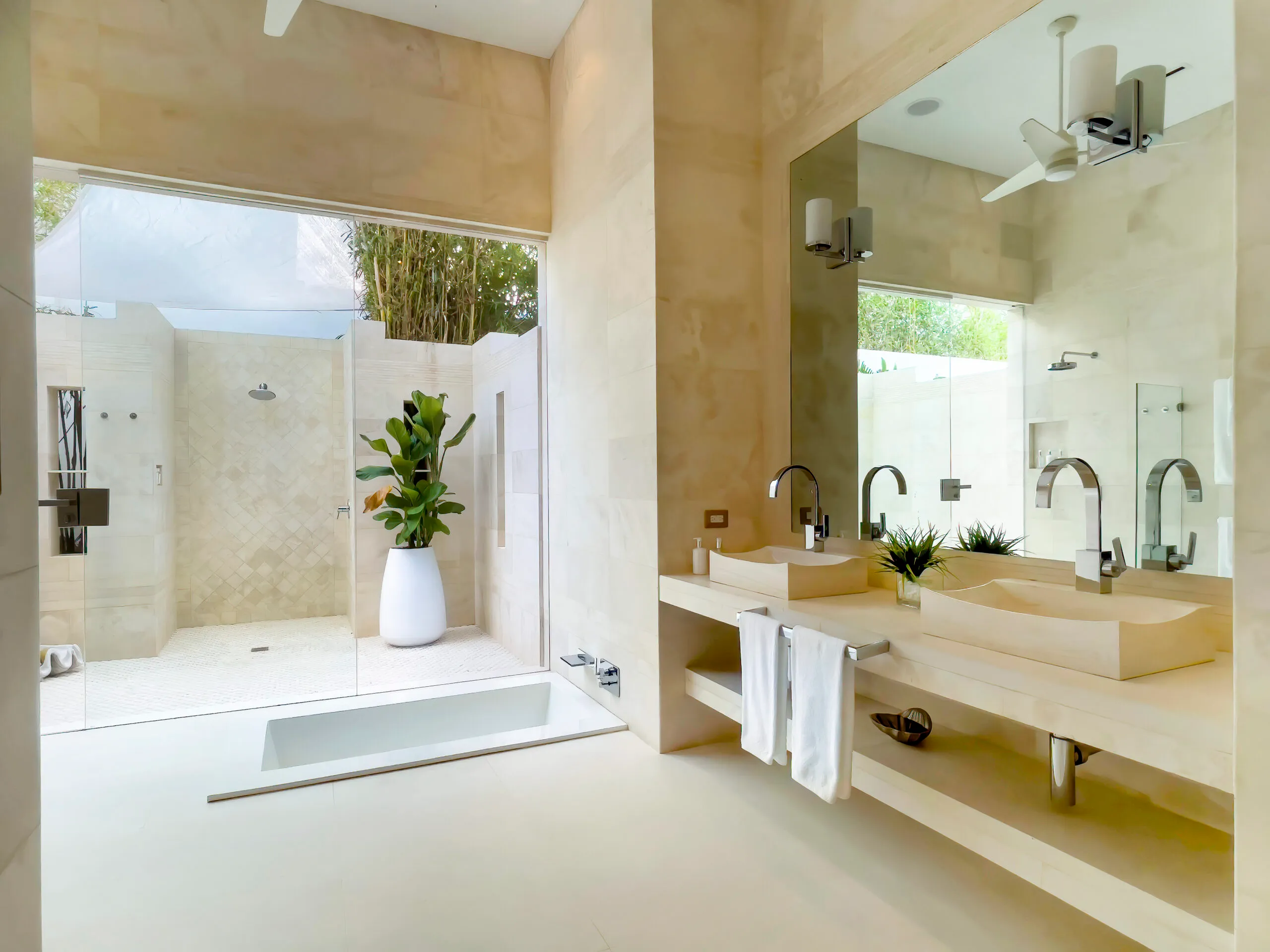 There are eight master bedrooms spread across the property, with seven in the main villa and one in a separate guest house, ideal for those looking for a little more privacy. The property has 10 large and luxurious bathrooms that feature fantastic outdoor showers and views of either the sea or the garden.