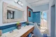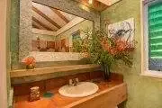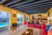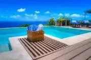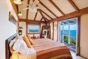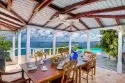 Unforgettable blue ocean views with a lovely sunset each evening are yours at this impressive property. A winding road leads you up into the breezy, green hills of Tortola’s south coast and to this stunning villa and to one of the island’s most magnificent seascapes. Toa-Toa is built as five pavilions arranged around the dramatic pool set in a sunny deck. Three pavilions border the pool deck: the central Great Room offers a convenient wet bar, all media, and two very plush overstuffed sofas for lounging; eclectic teak pieces and a variety of accessories gathered from world travels accent this living area. One of Toa-Toa’s four king master bedroom/bath suites – this one with an indoor/outdoor garden shower and a romantic four-poster bed – is situated directly above the Great Room. On one end of the pool deck is the alfresco dining area in a shady lanai; it adjoins a country-style kitchen, with the billiard room just next door. At the opposite end is the third pavilion with a second king suite, and the third and fourth king bedroom suites are in two additional pavilions (one above and one below), both easily accessible by steps from the pool deck. All four bedrooms are very spacious and well separated for serene privacy, and each offers its own individual mini-fridge, coffeemaker and a private covered balcony. Toa-Toa House is a serene and harmonious aerie perched between vast sky and blue ocean kissed by cooling tradewinds, a perfect hideaway for reading and relaxing, although you may not be able to take your eyes off the entrancing views. Lucy the cat may occasionally wander from the owner’s home over to Toa-Toa House to visit. Toa-Toa House is conveniently located near Nanny Cay, watersports, Road Town’s shops and restaurants, and is just a scenic drive away from your choice of beautiful North Shore and West End beaches