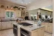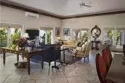 The living room has air conditioning, media center and to the side a large dining table for eating meals inside. There is a laundry room off the kitchen with a washer & dryer as well as a wine cooler.
