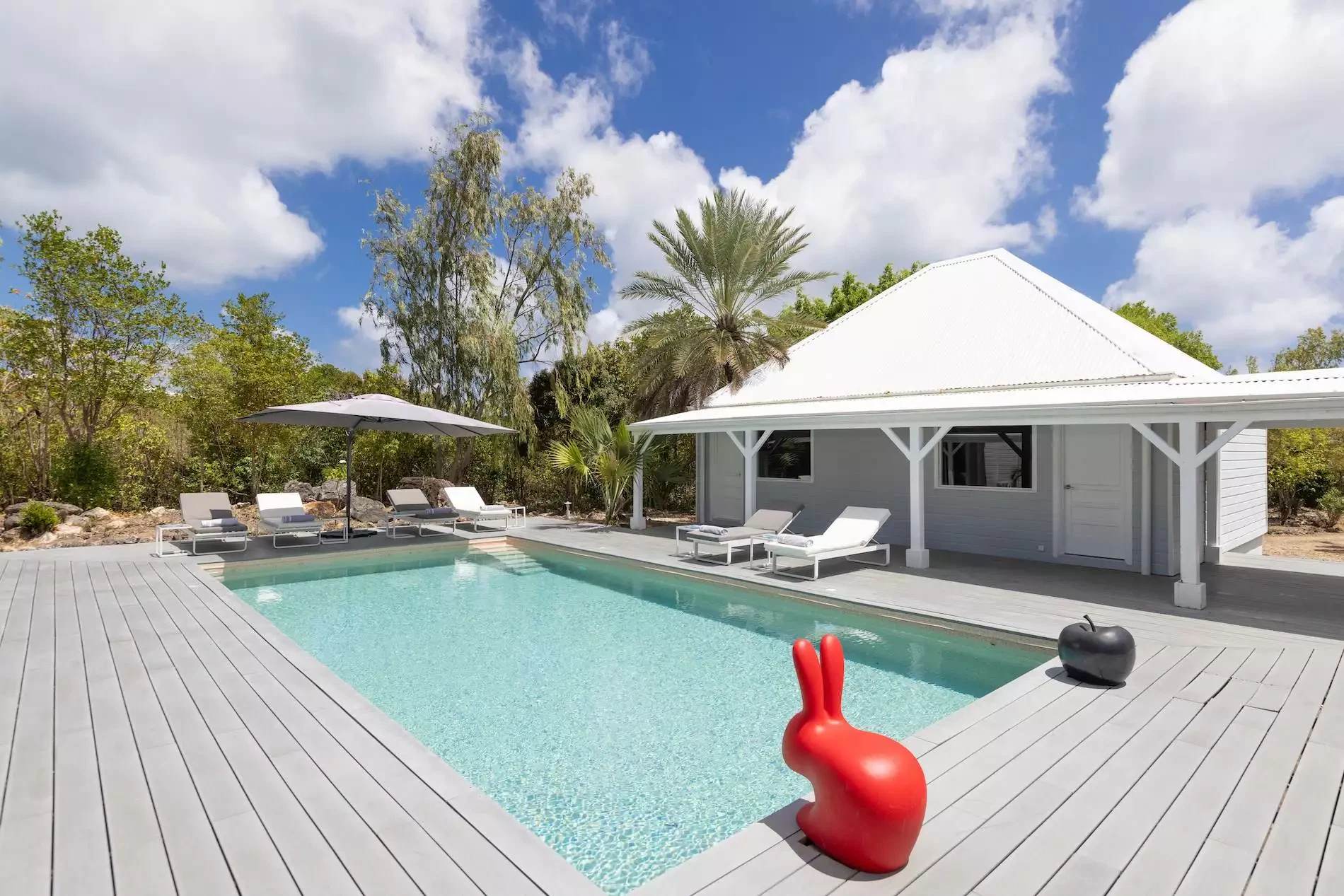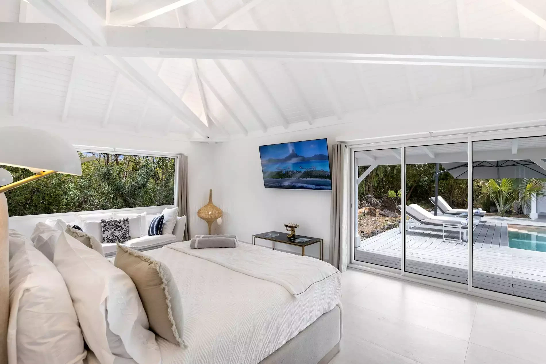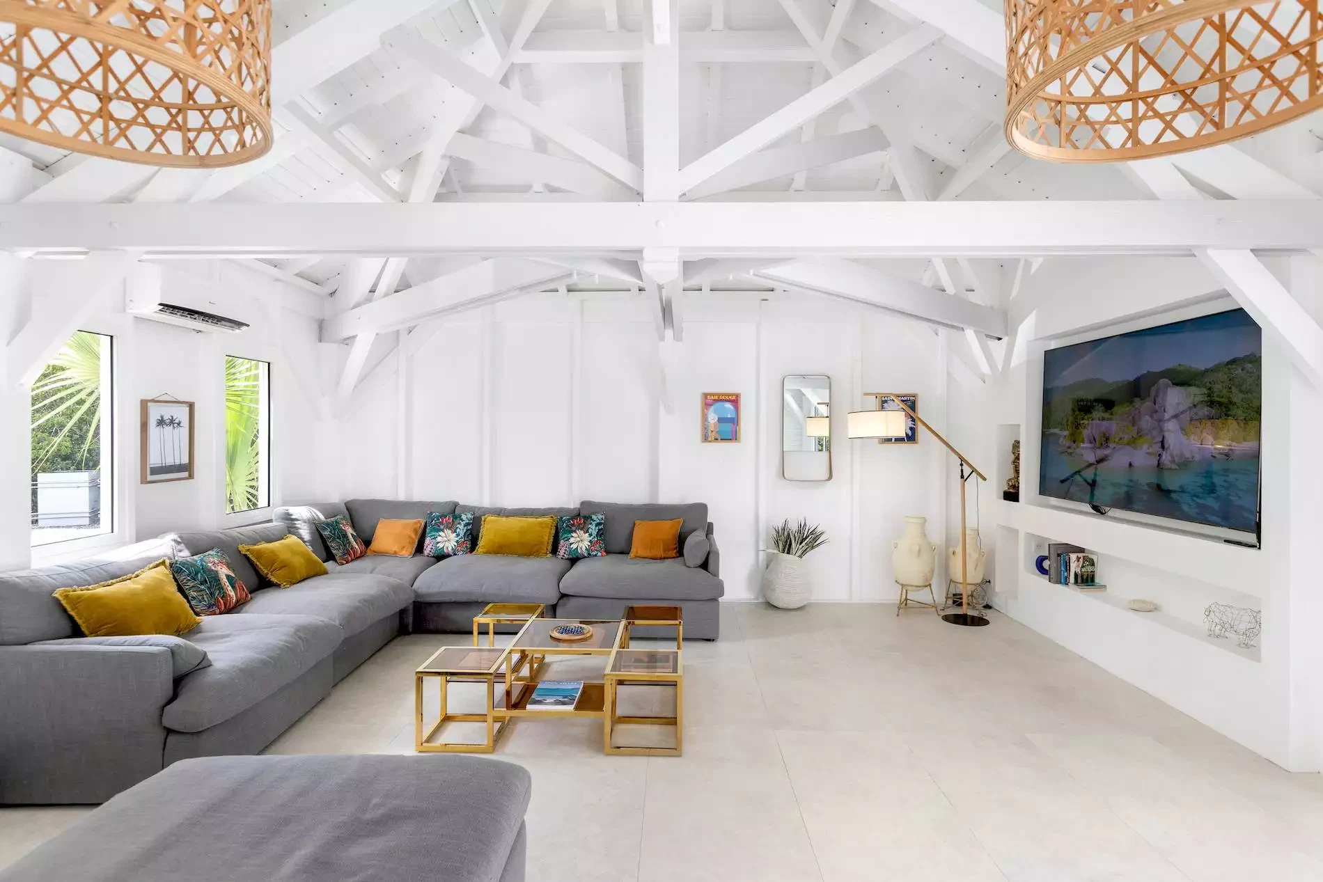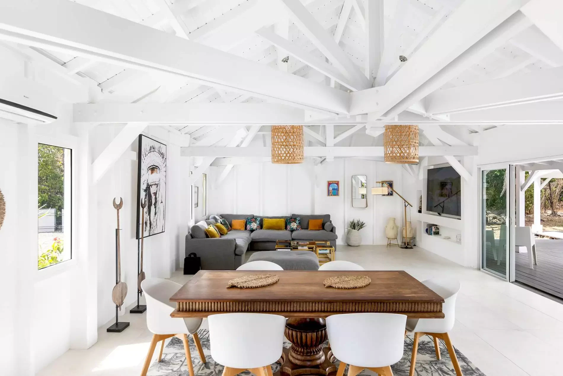 Designed in the traditional French Caribbean style with a contemporary twist, the villa is a serene retreat composed of several separate bungalows. This layout allows guests to enjoy both privacy and quality time together around the spacious central swimming pool. The fully air-conditioned living area and kitchen are housed in their own dedicated bungalow, offering a cozy and elegant space to cook, relax, or dine.