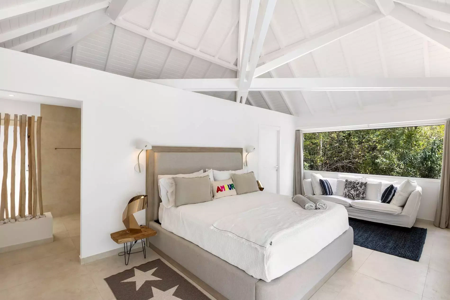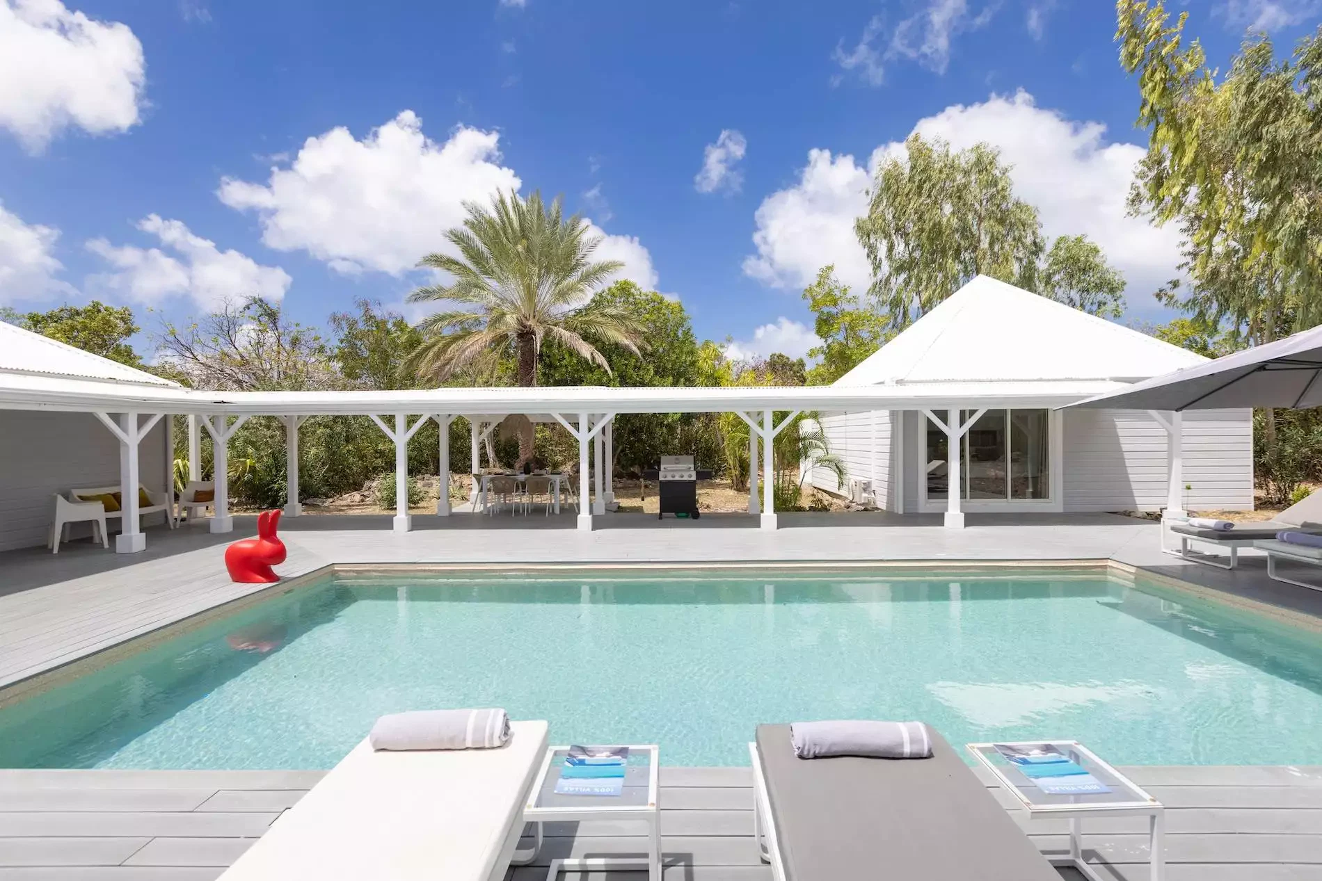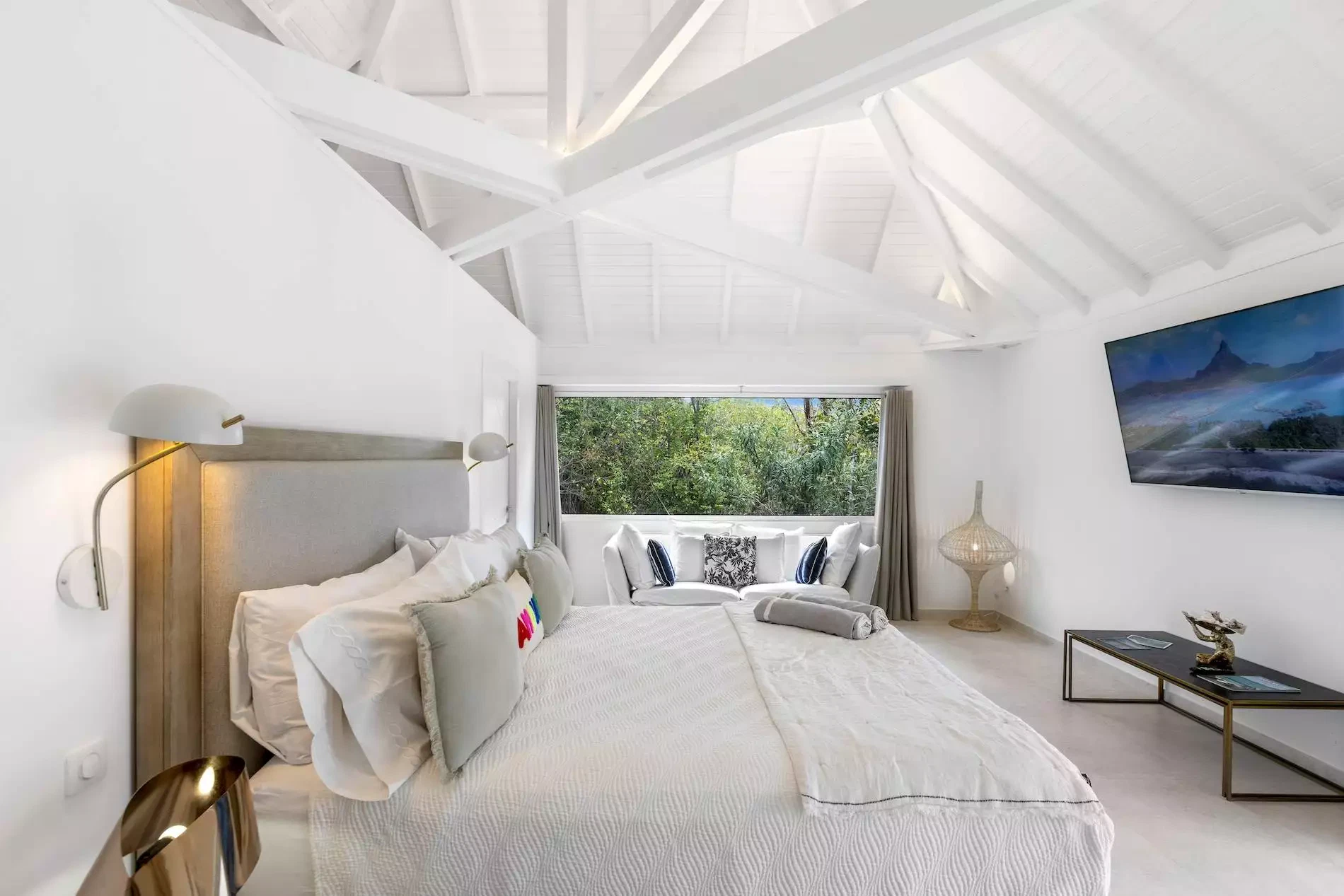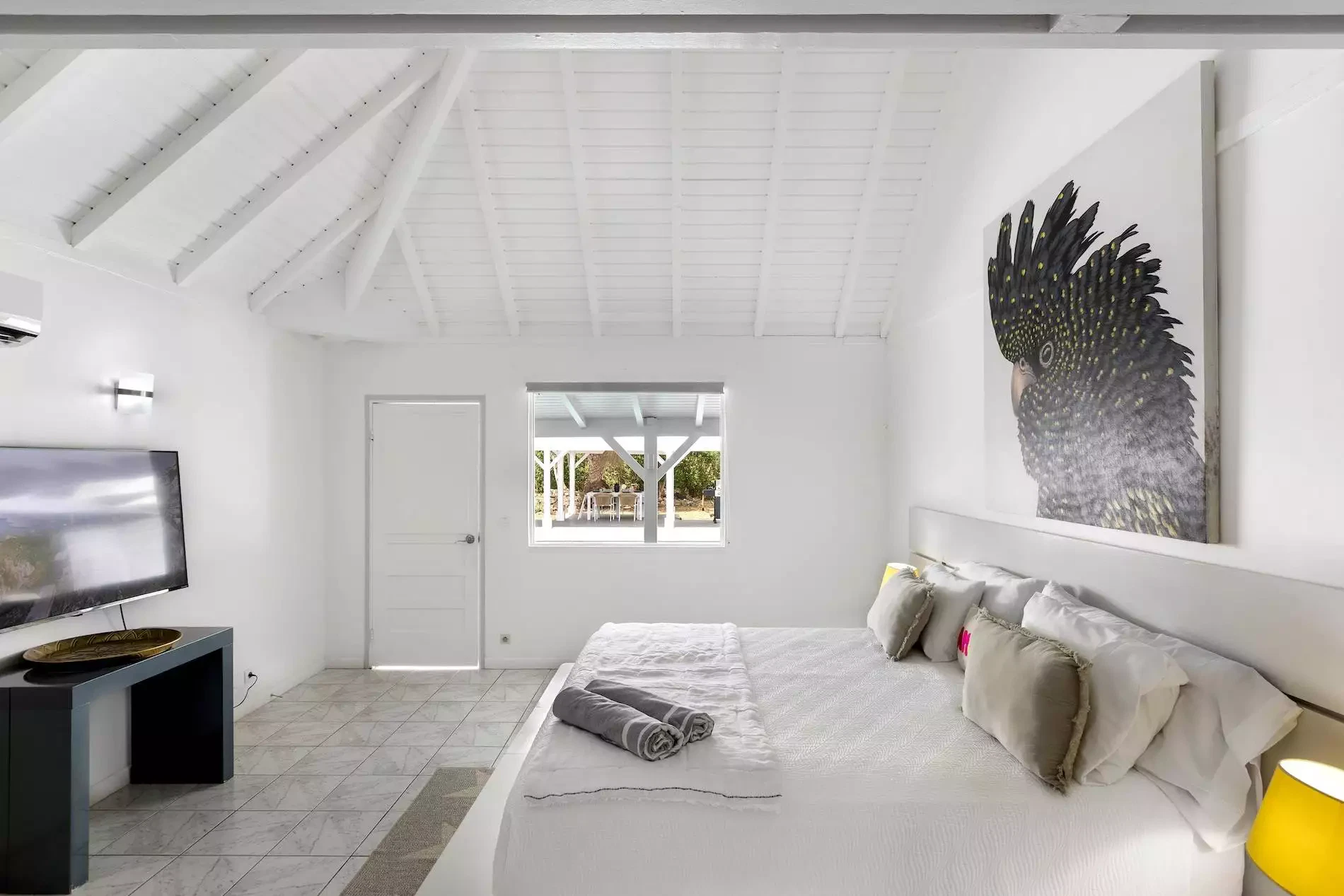 Designed in the traditional French Caribbean style with a contemporary twist, the villa is a serene retreat composed of several separate bungalows. This layout allows guests to enjoy both privacy and quality time together around the spacious central swimming pool. The fully air-conditioned living area and kitchen are housed in their own dedicated bungalow, offering a cozy and elegant space to cook, relax, or dine.