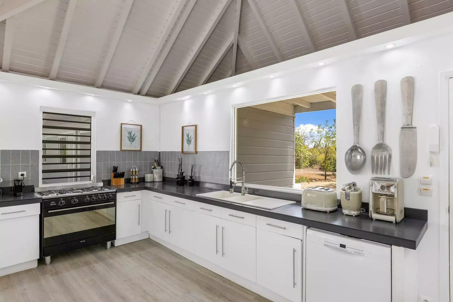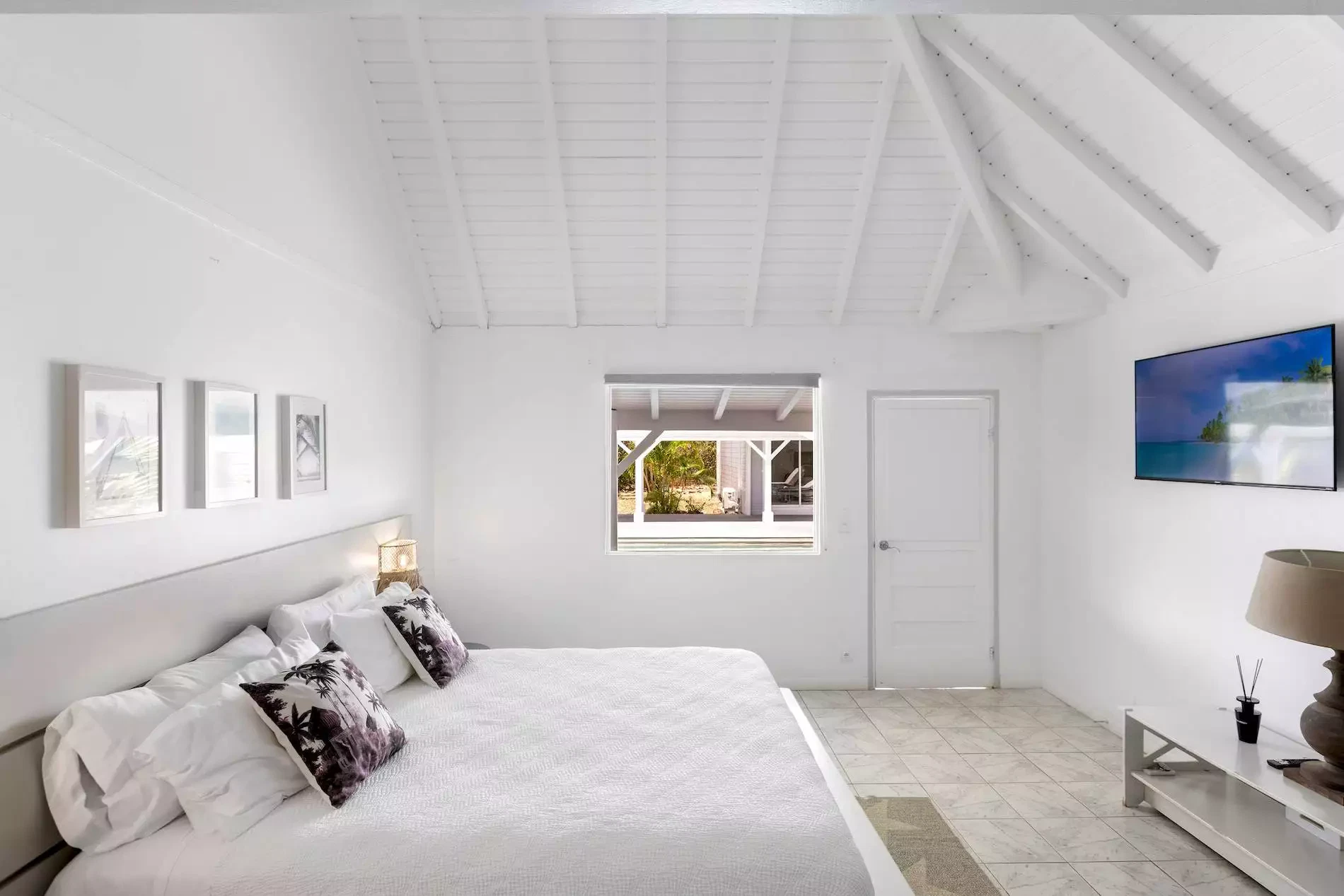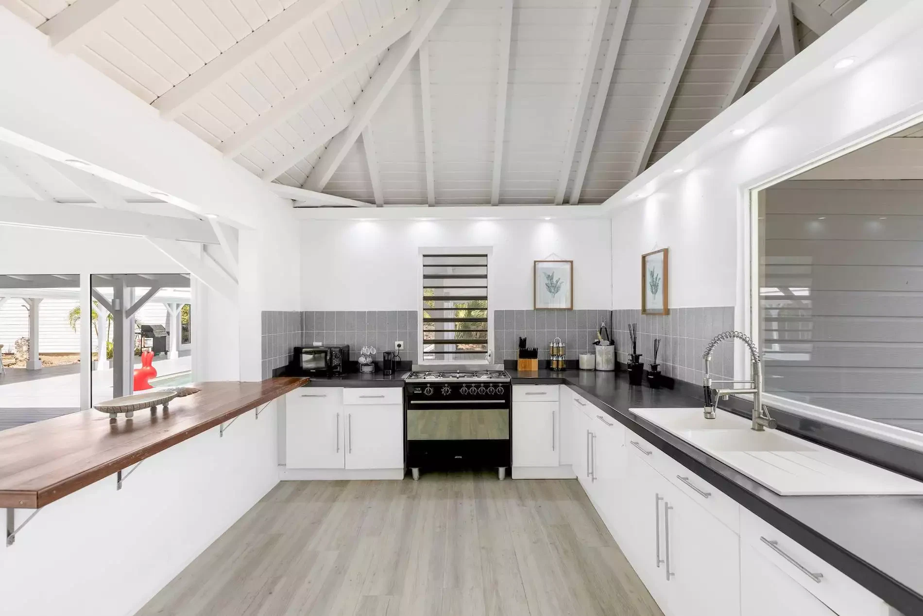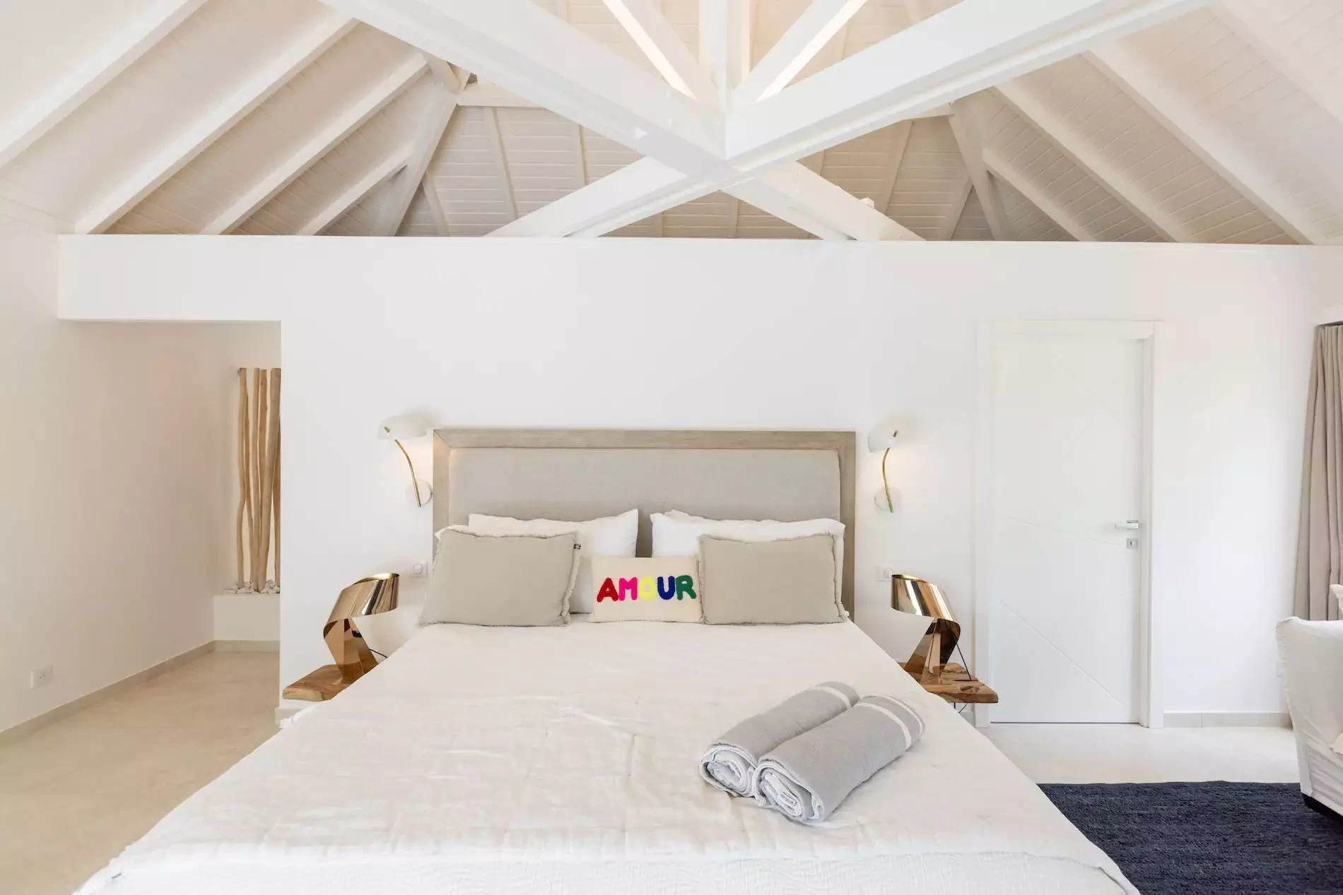 Designed in the traditional French Caribbean style with a contemporary twist, the villa is a serene retreat composed of several separate bungalows. This layout allows guests to enjoy both privacy and quality time together around the spacious central swimming pool. The fully air-conditioned living area and kitchen are housed in their own dedicated bungalow, offering a cozy and elegant space to cook, relax, or dine.