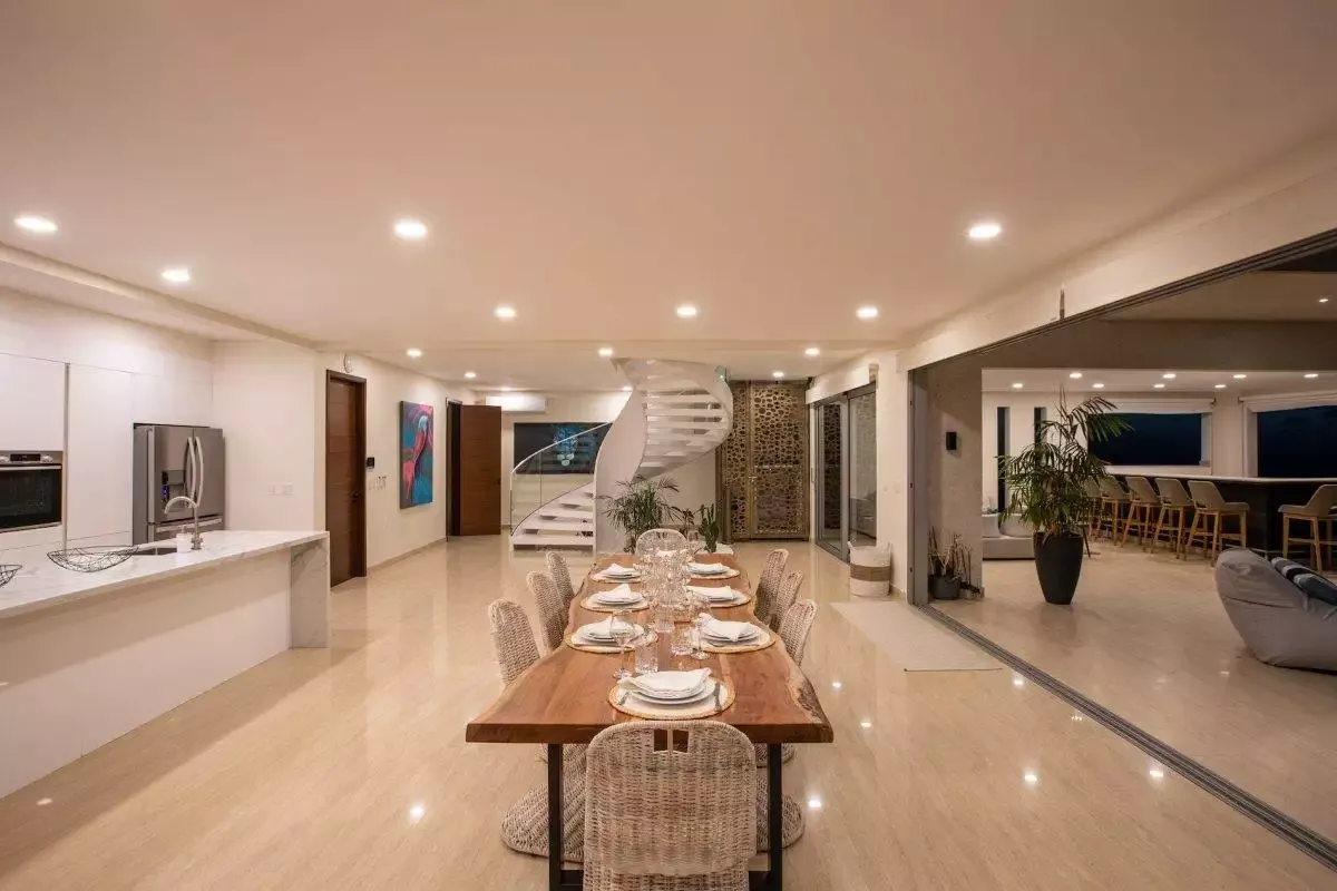 This large living space opens onto the infinity pool which overlooks the ocean and the beautiful Indigo Bay with its hills plunging into the turquoise waters.