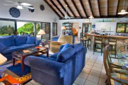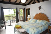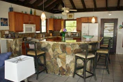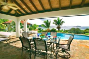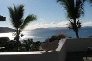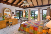 Situated only a short stroll from the pristine white sand beach of Mahoe Bay, this very private and just-refurbished four-bedroom villa offers a two-bedroom main pavilion flanked by Wendy’s Watch, a two-bedroom guest house. In the main house, the Great Room encompasses the living area and the kitchen with its center island and dining area; on either side are two air-conditioned bedroom/bath suites. All rooms open out to a covered area for dining and shady relaxation on the stone pool terrace. The two-story air-conditioned guest cottage offers a twin suite, and its upper floor is a complete studio apartment with a king bed and small kitchen. This property is graced by a freeform swimming pool, sunset views of several nearby islands, and lush landscaping with a variety of fruit trees and tropical flowers. Enchanting!